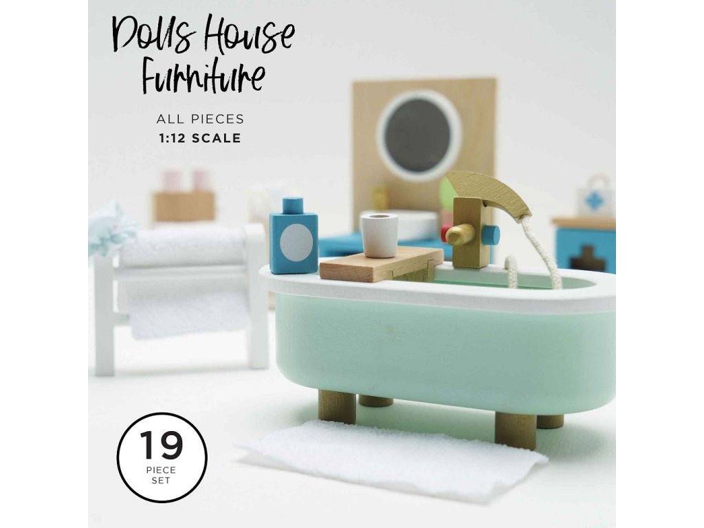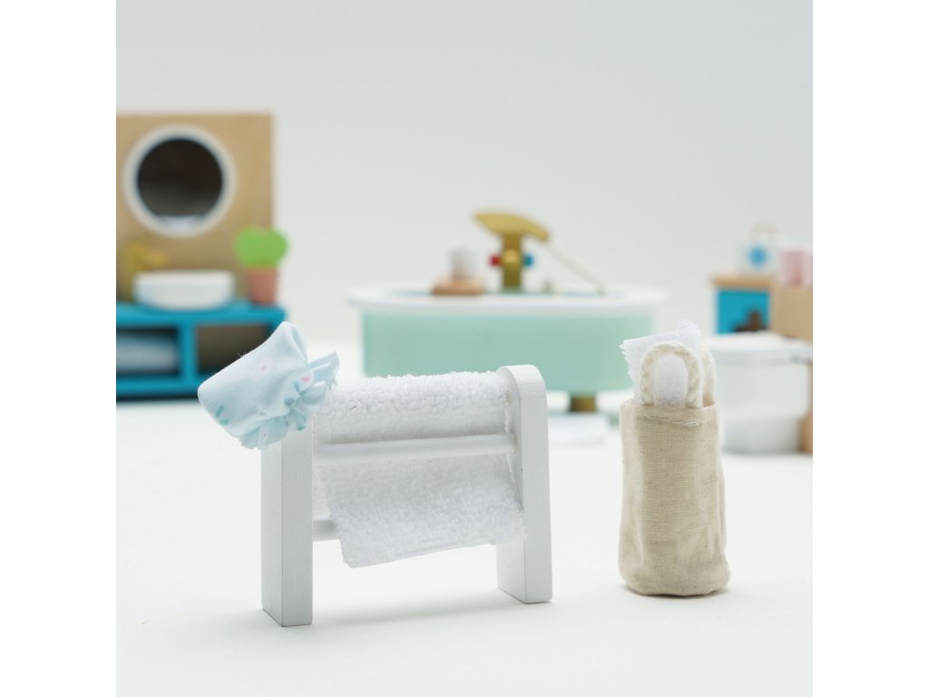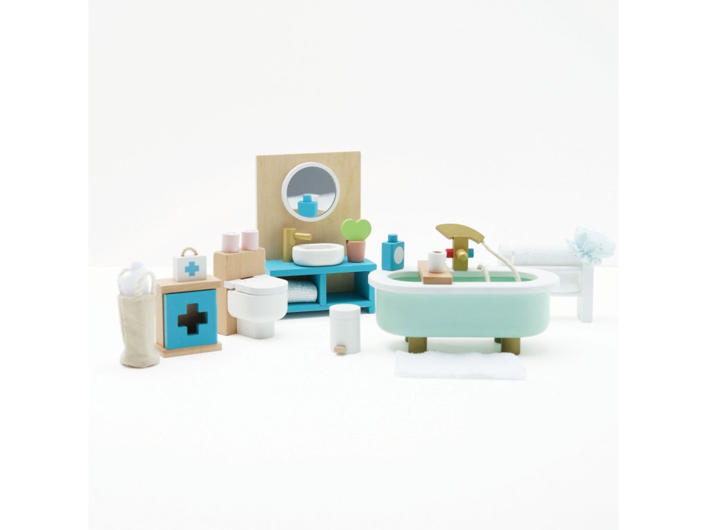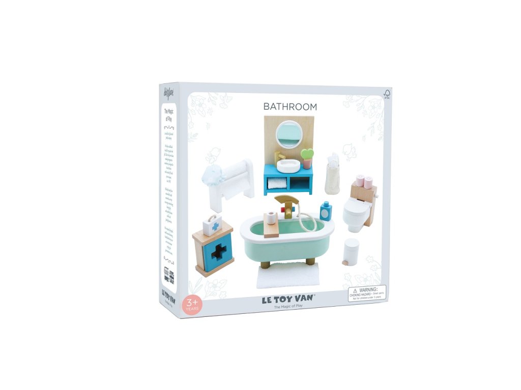 Tradiční a barevná sada nábytku a vybavení koupelny ze dřeva. Bude se perfektně hodit do dětských domečků pro panenky. Šest kusů nábytku a doplňky – vana, toaleta, umyvadlo, věšák na ručníky, lékárnička. Sada nábytku v retro stylu je vyrobena eticky za použití udržitelných materiálů. Velikostně se hodí do domečků pro panenky od Le Toy Van, více doplňků domečků z řady Daisylane najdete na našem webu. Hračky s účelemVšechny hračky firmy Le Toy Van jsou vyrobeny s cílem – aby dlouho vydržely. Designovány s láskou zkušenými řemeslníky za použití etických praktik a udržitelných materiálů, které jsou laskavější k naší planetě. Hlavní vlastnosti: měřítko 1:12vyrobeno eticky z udržitelných materiálůtestováno dle nejpřísnějších standardůmalováno netoxickými barvami na bázi vodytrénuje komunikační dovednosti a koordinaciinspiruje ke kreativní a představivé hře Daisylane kolekce: Prestižní kolekce domečků pro panenky a doplňků firmy Le Toy Van. Před více než 25 lety zakladatel Georges navrhl svůj úplně první domeček pro panenky, stavební kámen této firmy. Vyrobeno eticky z udržitelných materiálů, dřevěné domečky pro panenky Daisylane jsou jedinečné a nebudou dětskou představivost držet zpátky. Rodinné dědictví, opravdová investice do hraní.Doplňkové parametry