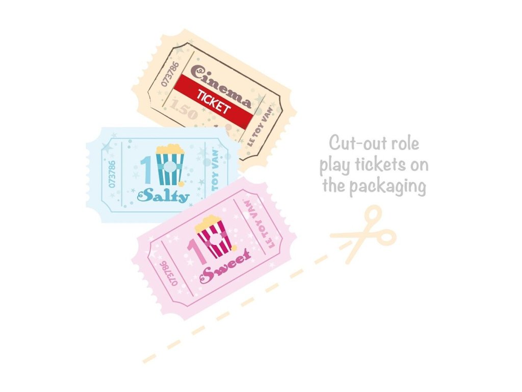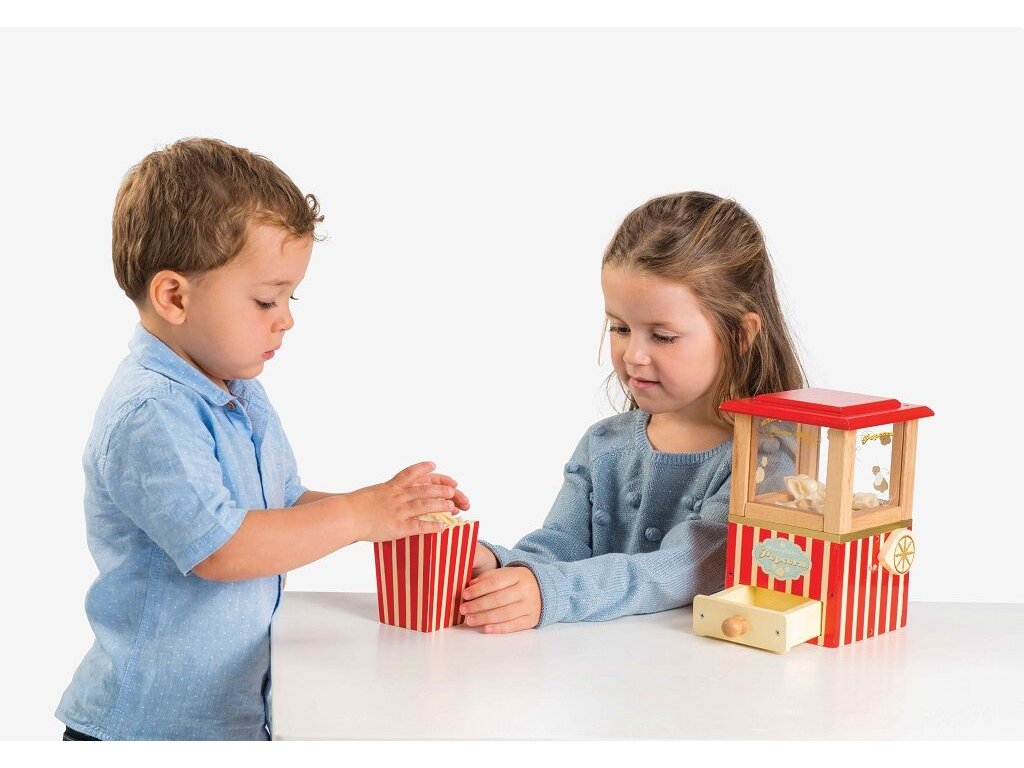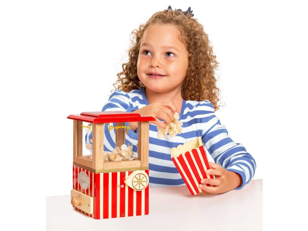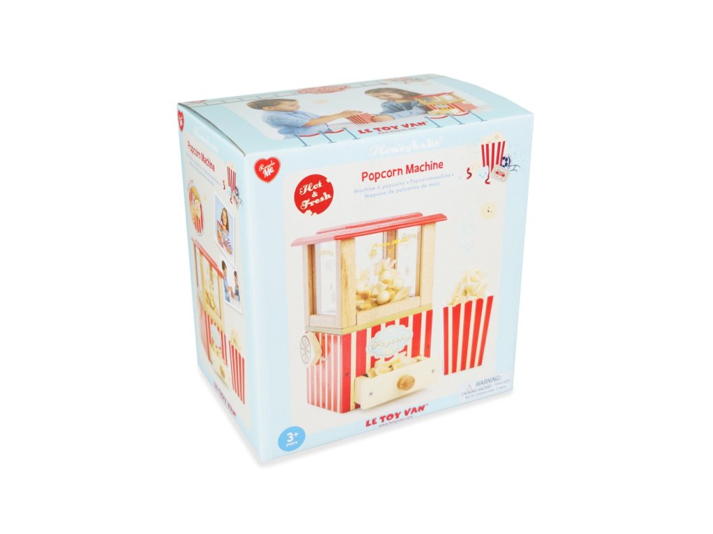 Čas na film a popkorn! Nostalgie a zábava, tato hračka nabídne obojí. Designováno talentovanými hračkáři, vyrobeno z udržitelného dřeva, bude se vyjímat v každém dětském pokoji. Vintage červená s krémovými proužky a přírodní dřevo rozproudí dětskou představivost. Použijte páčku pro „pukání popkornu“, 5 plstěných popkornů pak můžete vyjmout z šuplíku a vložit do veselé krabičky na popkorn. Ideální hračka pro trénink jemné motoriky a sociálních dovedností, pomůže také s rozvojem řeči. V balení najdete lístky do kina, lístky na sladký/slaný popkorn, které představivou hru ještě pozvednou. Hračky s účelemVšechny hračky firmy Le Toy Van jsou vyrobeny s cílem – aby dlouho vydržely. Designovány s láskou zkušenými řemeslníky za použití etických praktik a udržitelných materiálů, které jsou laskavější k naší planetě. Hlavní vlastnosti: vyrobeno eticky z udržitelného dřevatestováno dle nejpřísnějších standardůmalováno netoxickými barvami na bázi vodyinspiruje k představivé hřerozvíjí kognitivní dovednosti Ocenění hračky:Good Toy Guide RecommendedEuropean Product Design Award Winner 2018Independent Toy Awards Winner 2018 Honeybake kolekce: Hračky v této kolekci jsou vhodné k objevování, pomohou dětem s rozvojem představivosti, sociálních a verbálních dovedností a kognitivních funkcí. Tradiční design s moderními detaily děti jistě bude bavit. Honeybake je kolekce Le Toy Van, která vyhrála nejvíce ocenění, a to za design, kvalitu, bezpečnost a také za vzdělávací a herní hodnotu.Doplňkové parametry