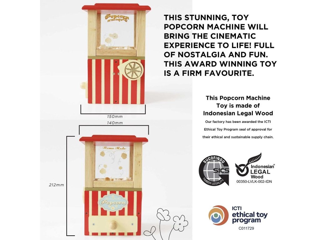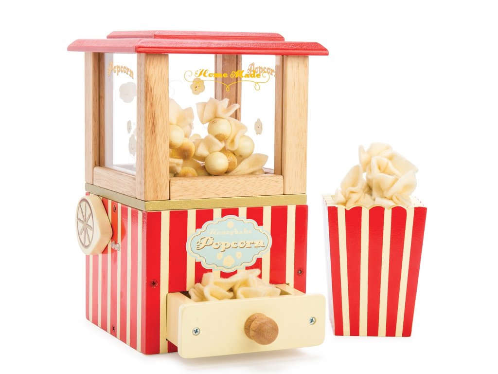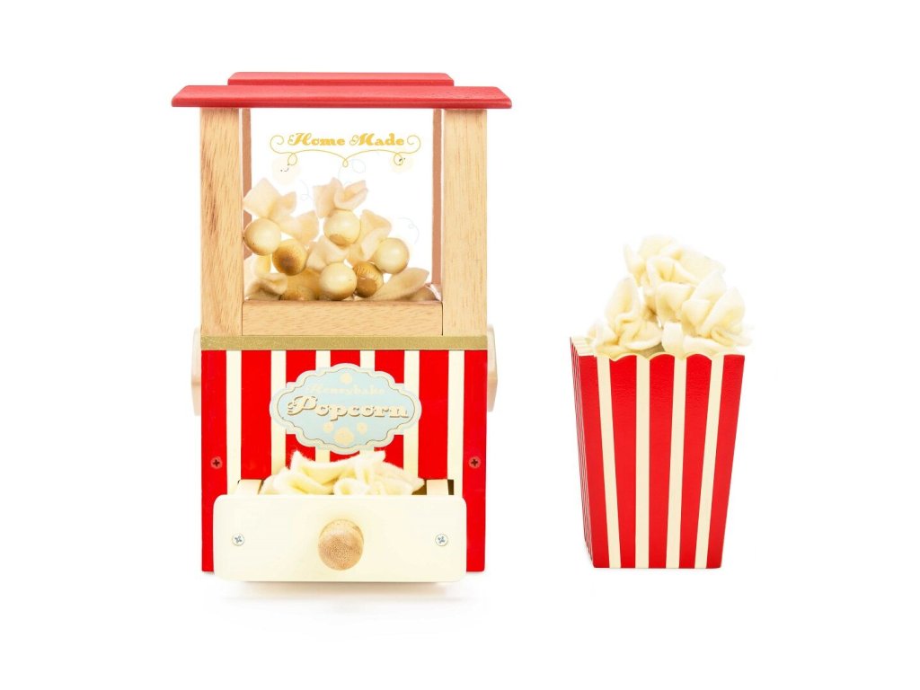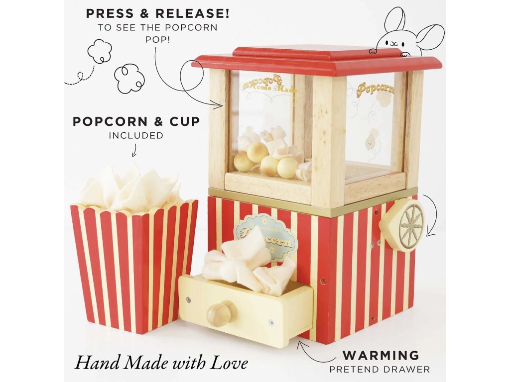 Čas na film a popkorn! Nostalgie a zábava, tato hračka nabídne obojí. Designováno talentovanými hračkáři, vyrobeno z udržitelného dřeva, bude se vyjímat v každém dětském pokoji. Vintage červená s krémovými proužky a přírodní dřevo rozproudí dětskou představivost. Použijte páčku pro „pukání popkornu“, 5 plstěných popkornů pak můžete vyjmout z šuplíku a vložit do veselé krabičky na popkorn. Ideální hračka pro trénink jemné motoriky a sociálních dovedností, pomůže také s rozvojem řeči. V balení najdete lístky do kina, lístky na sladký/slaný popkorn, které představivou hru ještě pozvednou. Hračky s účelemVšechny hračky firmy Le Toy Van jsou vyrobeny s cílem – aby dlouho vydržely. Designovány s láskou zkušenými řemeslníky za použití etických praktik a udržitelných materiálů, které jsou laskavější k naší planetě. Hlavní vlastnosti: vyrobeno eticky z udržitelného dřevatestováno dle nejpřísnějších standardůmalováno netoxickými barvami na bázi vodyinspiruje k představivé hřerozvíjí kognitivní dovednosti Ocenění hračky:Good Toy Guide RecommendedEuropean Product Design Award Winner 2018Independent Toy Awards Winner 2018 Honeybake kolekce: Hračky v této kolekci jsou vhodné k objevování, pomohou dětem s rozvojem představivosti, sociálních a verbálních dovedností a kognitivních funkcí. Tradiční design s moderními detaily děti jistě bude bavit. Honeybake je kolekce Le Toy Van, která vyhrála nejvíce ocenění, a to za design, kvalitu, bezpečnost a také za vzdělávací a herní hodnotu.Doplňkové parametry