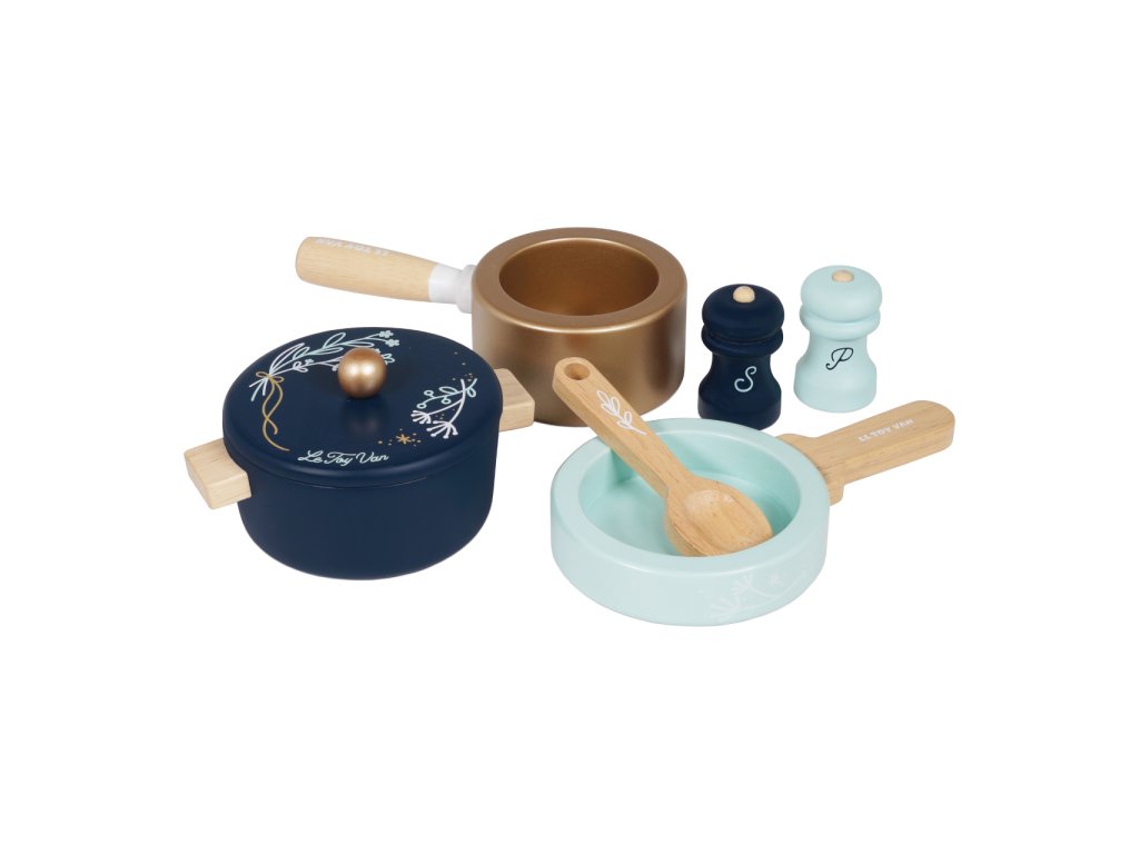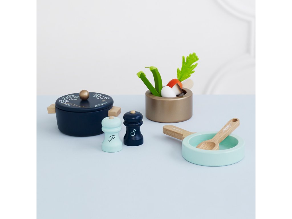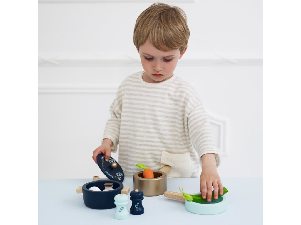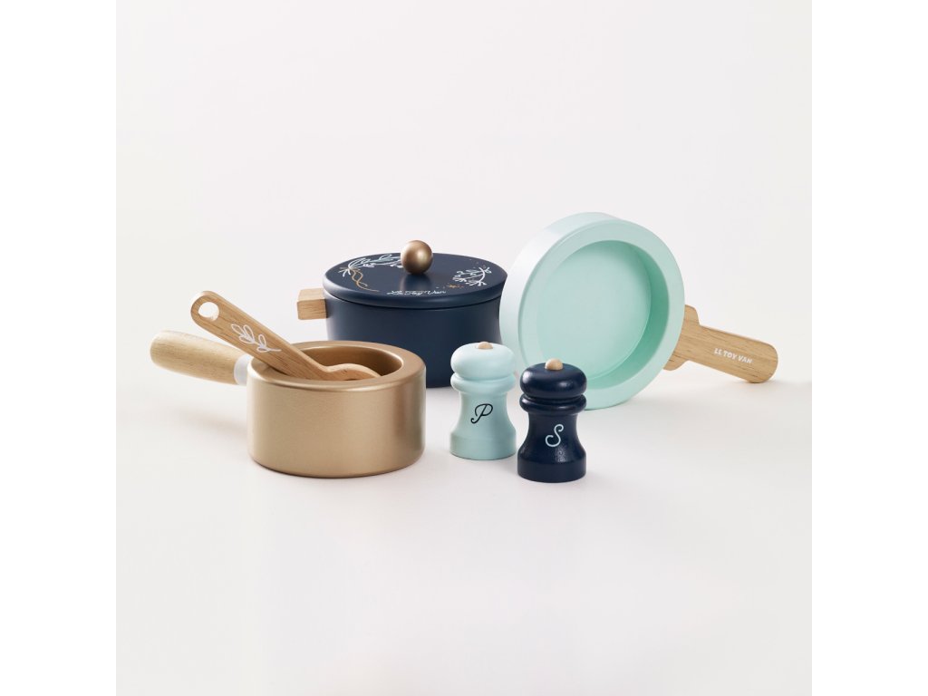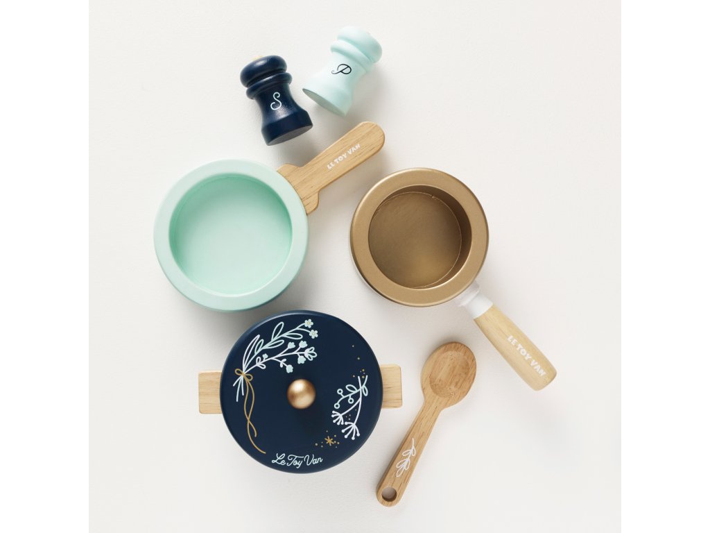 Sada nádobí pro mladé začínající kuchaře a kuchařky. Představivé dobroty mohou uvařit ve velkém hrnci s poklicí, hrnci s rukojetí a pánvičce. Dalšími doplňky sady jsou vařečka, solnička a pepřenka. Hračka je vyrobena z udržitelného masivního dřeva, malována ručně netoxickými barvami na bázi vody. Vhodné také jako doplněk dětských kuchyněk. Hračky s účelemVšechny hračky firmy Le Toy Van jsou vyrobeny s cílem – aby dlouho vydržely. Designovány s láskou zkušenými řemeslníky za použití etických praktik a udržitelných materiálů, které jsou laskavější k naší planetě. Hlavní vlastnosti: vyrobeno eticky z udržitelného dřevatestováno dle nejpřísnějších standardůmalováno netoxickými barvami na bázi vodyinspiruje k představivé hřerozvíjí kognitivní dovednosti Honeybake kolekce: Hračky v této kolekci jsou vhodné k objevování, pomohou dětem s rozvojem představivosti, sociálních a verbálních dovedností a kognitivních funkcí. Tradiční design s moderními detaily děti jistě bude bavit. Honeybake je kolekce Le Toy Van, která vyhrála nejvíce ocenění, a to za design, kvalitu, bezpečnost a také za vzdělávací a herní hodnotu. Značka a certifikát FSC® (Forest Stewardship Council) zaručuje, že dřevo, ze kterého byl produkt vyroben, nebylo vytěženo nelegálně a pochází z lesů obhospodařovaných šetrným či přírodě blízkým způsobem, ve kterém jsou dodržovány přísné environmentální a sociální požadavky. Značka FSC® na výrobku znamená, že svým nákupem pomáháte chránit lesy a podporujete šetrné, odpovědné či přírodě blízké hospodaření, díky kterému jsou naše lesy stabilnější, zdravější, mají přirozenou druhovou skladbu a lépe odolávají negativním následkům klimatických změn.Doplňkové parametry