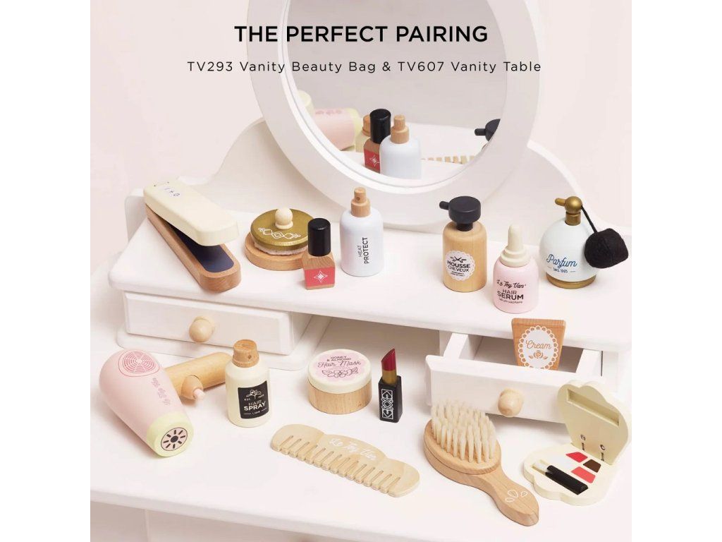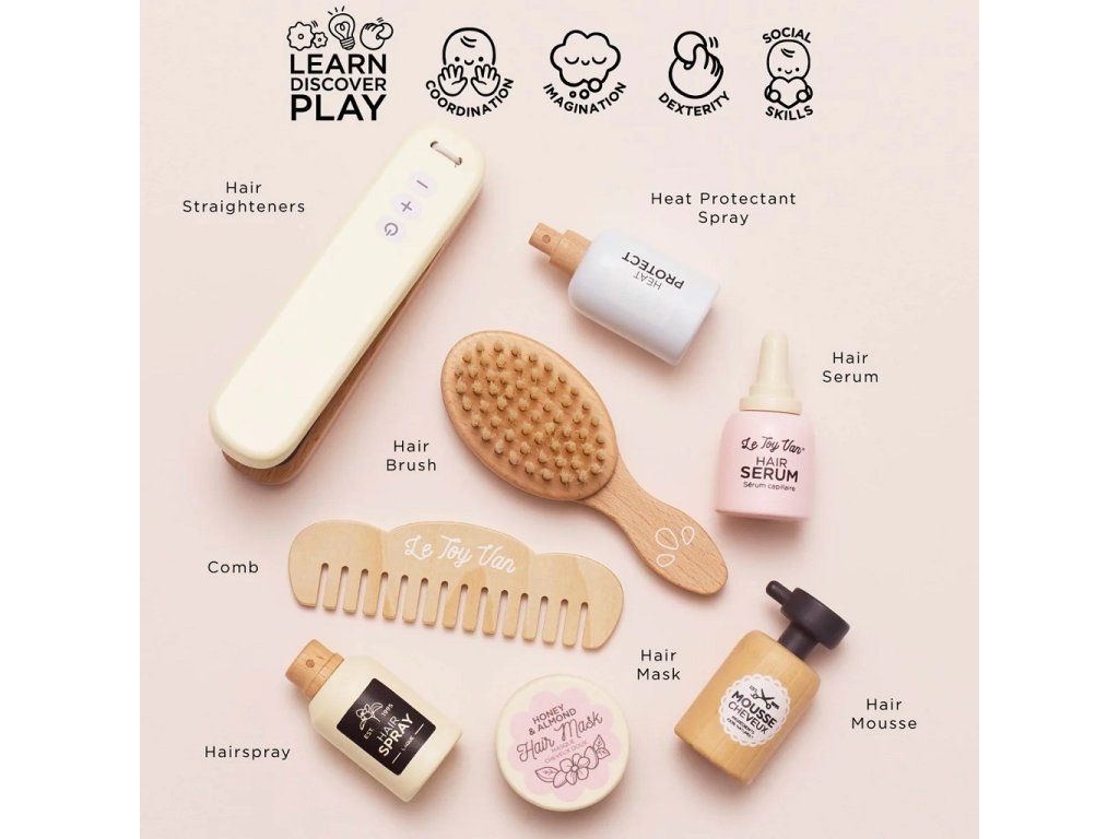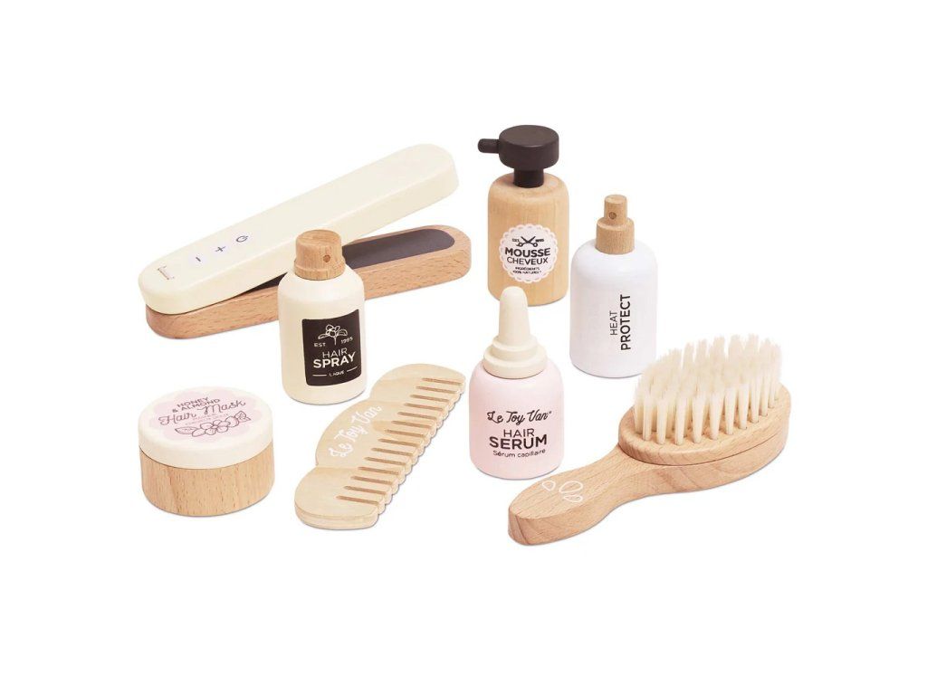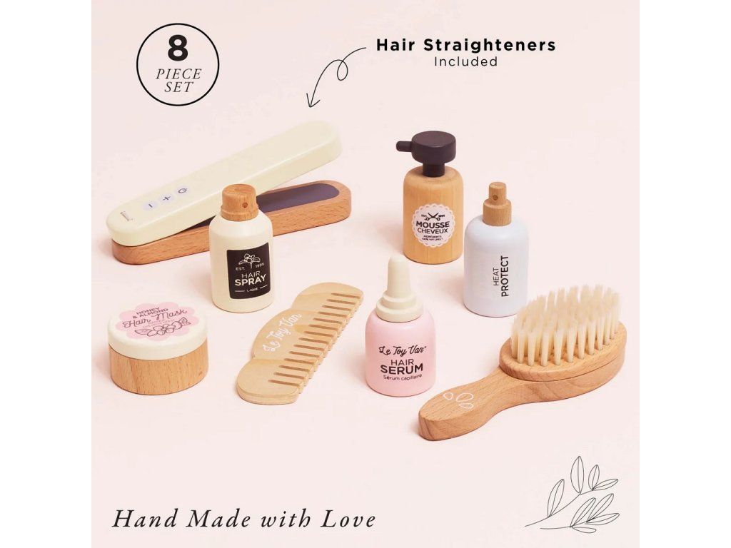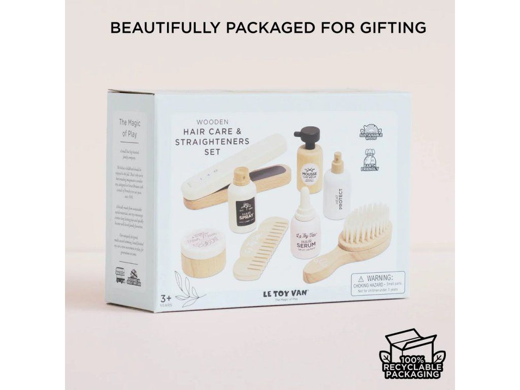 Hair Care & Straighteners Set, to je stylová sada pro malé kadeřnice a kadeřníky. Připravte se na hodiny dětské zábavy a kreativní hry s touto krásnou sadou. Ideální pro malé stylistky a stylisty, kteří milují hraní na kadeřnictví nebo salon. Hračka je navržena s ohledem na bezpečnost, kvalitu a dlouhodobou trvanlivost.Sada obsahuje žehličku na vlasy, hřeben, kartáč, a navíc detailní kosmetické doplňky pro fiktivní péči o vlasy jako jsou lahvičky se sprejem, maskou, sérem, pěnou, ochranným sprejem či lakem, což podporuje malé děti v představivém hraní a napodobování salónních procedur.Hra s touto sadou rozvíjí fantazii, sociální dovednosti a jemnou motoriku. Děti si mohou hrát na kadeřníky, upravit panenkám nebo kamarádům účes, kombinovat doplňky a vytvářet vlastní příběhy. Vyrobeno z certifikovaného dřeva FSC®, ručně malováno vodou ředitelnými netoxickými barvami a plně testováno podle přísných bezpečnostních standardů pro hračky. Hlavní vlastnosti: obsahuje 8 ksvyrobeno z FSC® dřeva ideální první kadeřnická/beauty sada rozvíjí kreativitu, představivost a jemnou motorikupodporuje hraní rolí, sociální interakci a manuální dovednosti Značka a certifikát FSC® (Forest Stewardship Council) zaručuje, že dřevo, ze kterého byl produkt vyroben, nebylo vytěženo nelegálně a pochází z lesů obhospodařovaných šetrným či přírodě blízkým způsobem, ve kterém jsou dodržovány přísné environmentální a sociální požadavky. Značka FSC® na výrobku znamená, že svým nákupem pomáháte chránit lesy a podporujete šetrné, odpovědné či přírodě blízké hospodaření, díky kterému jsou naše lesy stabilnější, zdravější, mají přirozenou druhovou skladbu a lépe odolávají negativním následkům klimatických změn.Doplňkové parametry