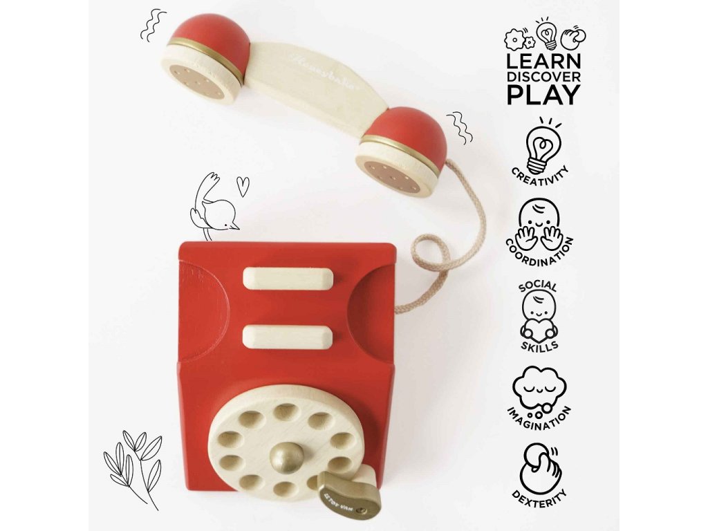 Crr, crr! Krásný retro telefon tak, jak ho znají starší ročníky. Je vyroben z přírodního a odolného kaučukového dřeva, malován sytě červenou barvou, najdete na něm také zlaté detaily. Děti mohou zavolat svým panenkám nebo plyšákům, zvonek ve sluchátku a otočný ciferník hře dodají realistický ráz. Děti si kromě motoriky a představivosti procvičí také poznávání čísel.Tato udržitelná hračka je stavěna na každodenní hru, podpoří děti v brzkém rozvoji, zlepší jejich zručnost a jemnou motoriku. Hračky s účelemVšechny hračky firmy Le Toy Van jsou vyrobeny s cílem – aby dlouho vydržely. Designovány s láskou zkušenými řemeslníky za použití etických praktik a udržitelných materiálů, které jsou laskavější k naší planetě. Hlavní vlastnosti: zvonek ve sluchátkutestováno dle nejpřísnějších standardůvyrobeno eticky z udržitelného dřevamalováno netoxickými barvami na bázi vodyinspiruje k představivé hřekompatibilní s dalšími produkty Honeybake Honeybake kolekce: Hračky v této kolekci jsou vhodné k objevování, pomohou dětem s rozvojem představivosti, sociálních a verbálních dovedností a kognitivních funkcí. Tradiční design s moderními detaily děti jistě bude bavit. Honeybake je kolekce Le Toy Van, která vyhrála nejvíce ocenění, a to za design, kvalitu, bezpečnost a také za vzdělávací a herní hodnotu.Doplňkové parametry