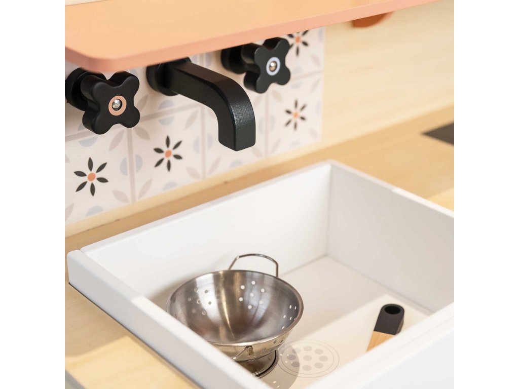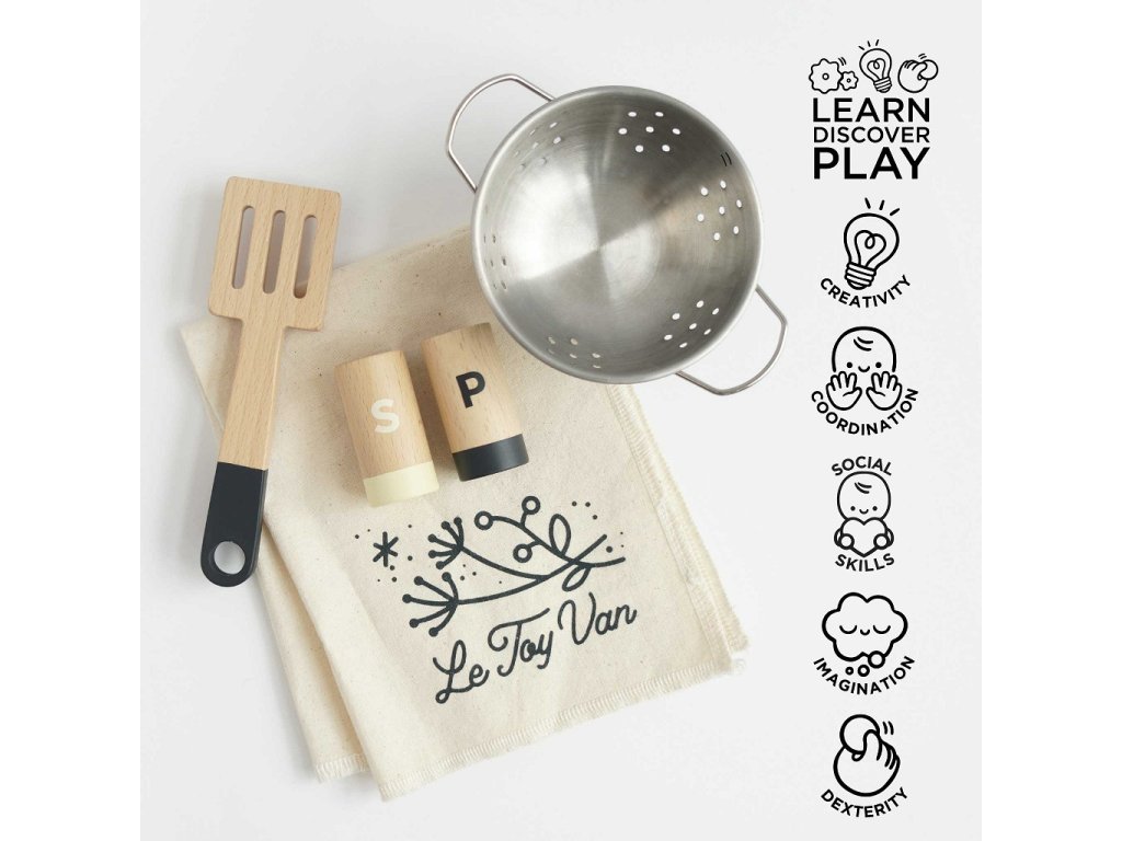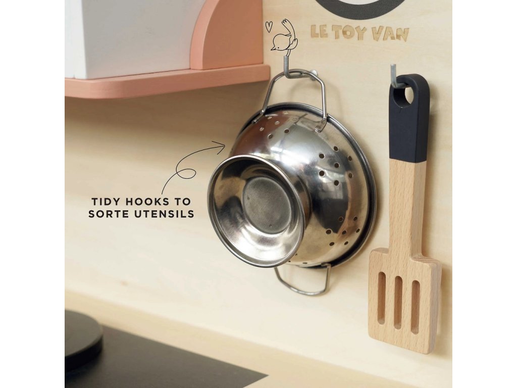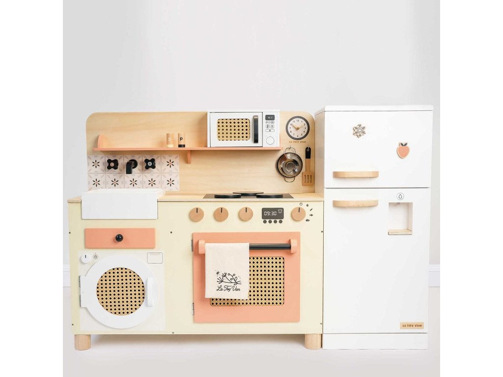 Uvařte si nebeské pokrmy s touto dřevěnou kuchyňkou snů v retro stylu. Je nabitá interaktivními funkcemi pro hodiny realistického hraní rolí. Objevte dřez, troubu, pračku, otočné kohoutky a fungující ciferníky trouby. Navíc je tu mikrovlnná trouba, hodiny a spousta úložného prostoru. Kuchyňka je vyrobena ze dřeva s certifikací FSC® (dřevo z lesů obhospodařovaných udržitelným způsobem) a zdobena barvami na vodní bázi bezpečnými pro děti. Díky designu kombinující jemné pastelové barvy s přírodním provedením, pěknými potištěnými dlaždicemi a ratanovými detaily se stává skvělým dopňkem do každého pokojíku! Hračky s účelemVšechny hračky firmy Le Toy Van jsou vyrobeny s cílem – aby dlouho vydržely. Designovány s láskou zkušenými řemeslníky za použití etických praktik a udržitelných materiálů, které jsou laskavější k naší planetě. Hlavní vlastnosti: vyrobeno eticky z FSC udržitelného dřevamalováno netoxickými barvami na bázi vodytestováno dle nejpřísnějších standardůobsahuje kuchyň, cedník, utěrku, mikrovlnku, sůl a pepřinspiruje k nápadité hře Značka a certifikát FSC® (Forest Stewardship Council) zaručuje, že dřevo, ze kterého byl produkt vyroben, nebylo vytěženo nelegálně a pochází z lesů obhospodařovaných šetrným či přírodě blízkým způsobem, ve kterém jsou dodržovány přísné environmentální a sociální požadavky. Značka FSC® na výrobku znamená, že svým nákupem pomáháte chránit lesy a podporujete šetrné, odpovědné či přírodě blízké hospodaření, díky kterému jsou naše lesy stabilnější, zdravější, mají přirozenou druhovou skladbu a lépe odolávají negativním následkům klimatických změn.Doplňkové parametry