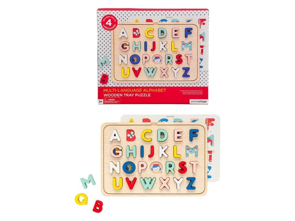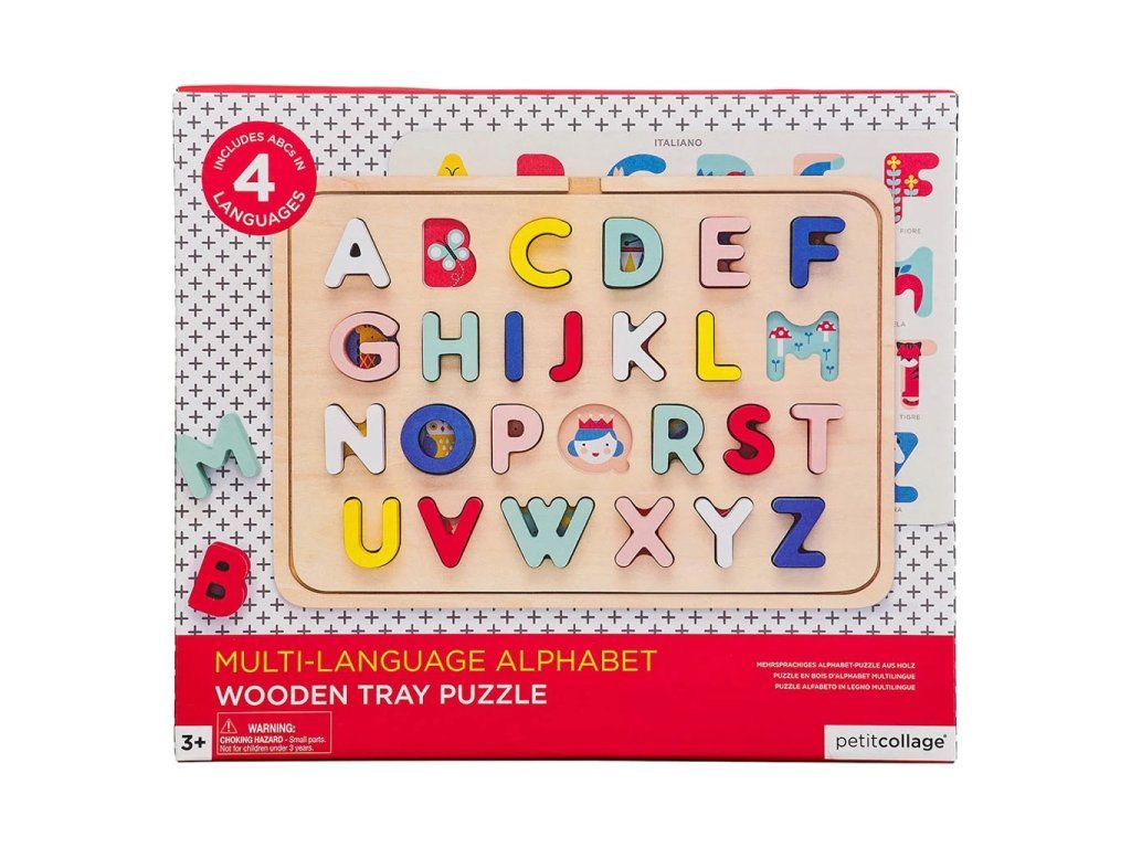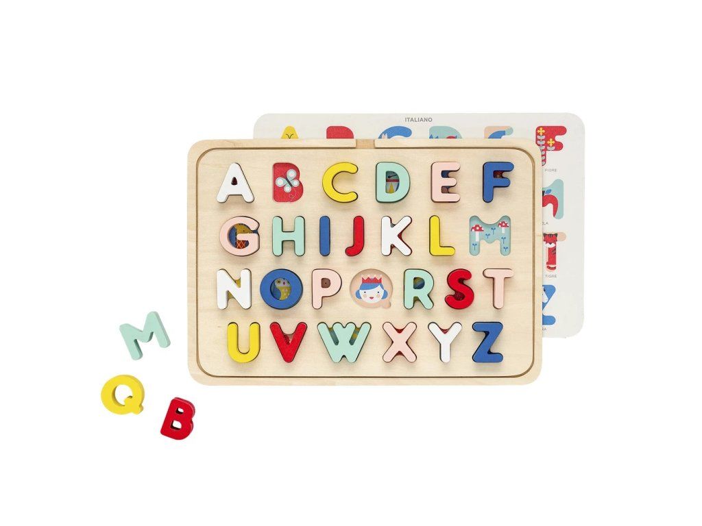 S touto barevnou abecedou si děti mohou procvičit svou znalost abecedy a naučit se nová slovíčka v angličtině, francouzštině, italštině či němčině. Inovativní dřevěné puzzle - po zvednutí písmen pod nimi děti najdou krasné ilustrace, které korespondují s daným písmenem – v angličtině – A apple (jablko), B butterfly (motýl), C cat (kočka). Po otočení vrstvy najdete ilustrace odpovídající i 3 dalším jazykům. Hlavní vlastnosti: 26 zaoblených dílkůprocvičování abecedyslovíčka ve 4 jazycích vyrobeno z FSC dřeva a potištěno vodou ředitelnými barvami a laky Značka a certifikát FSC® (Forest Stewardship Council) zaručuje, že dřevo, ze kterého byl produkt vyroben, nebylo vytěženo nelegálně a pochází z lesů obhospodařovaných šetrným či přírodě blízkým způsobem, ve kterém jsou dodržovány přísné environmentální a sociální požadavky. Značka FSC® na výrobku znamená, že svým nákupem pomáháte chránit lesy a podporujete šetrné, odpovědné či přírodě blízké hospodaření, díky kterému jsou naše lesy stabilnější, zdravější, mají přirozenou druhovou skladbu a lépe odolávají negativním následkům klimatických změn.Doplňkové parametry