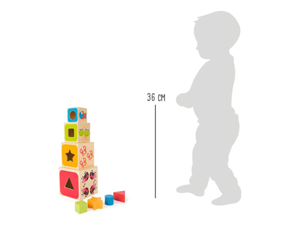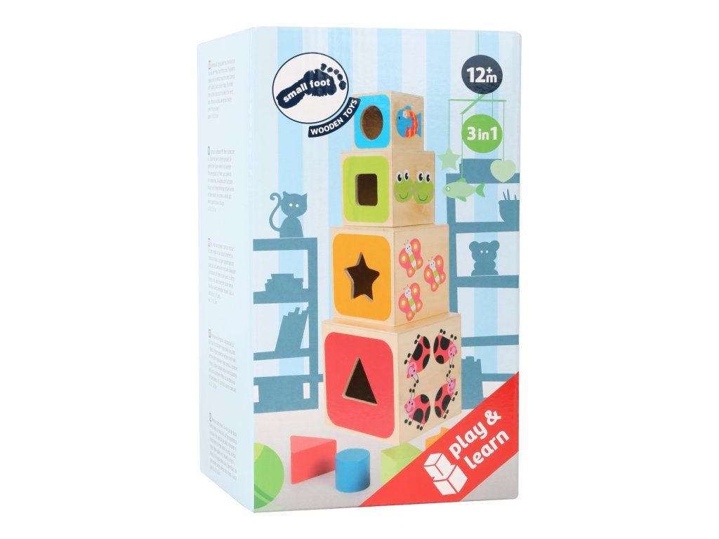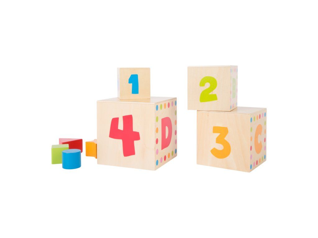 Dřevěné vkládací kostky učí děti geometrickým tvarům, barvám, číslům i písmenům. Geometrické tvary musí být vloženy přes správné otvory. Vytištěná písmena na kostkách musí být naskládána ve správném pořadí, což nabízí optimální výukový nástroj. Upevňuje jemnou motoriku dítěte. Roztomilé motivy zvířátek děti zaujmou a učení pro ně bude velkou zábavou. Hlavní vlastnosti: obsahuje 4 vkládací kostkyučí děti geometrickým tvarům, barvám, číslům a písmenůmprocvičuje jemnou motoriku dětíDoplňkové parametry