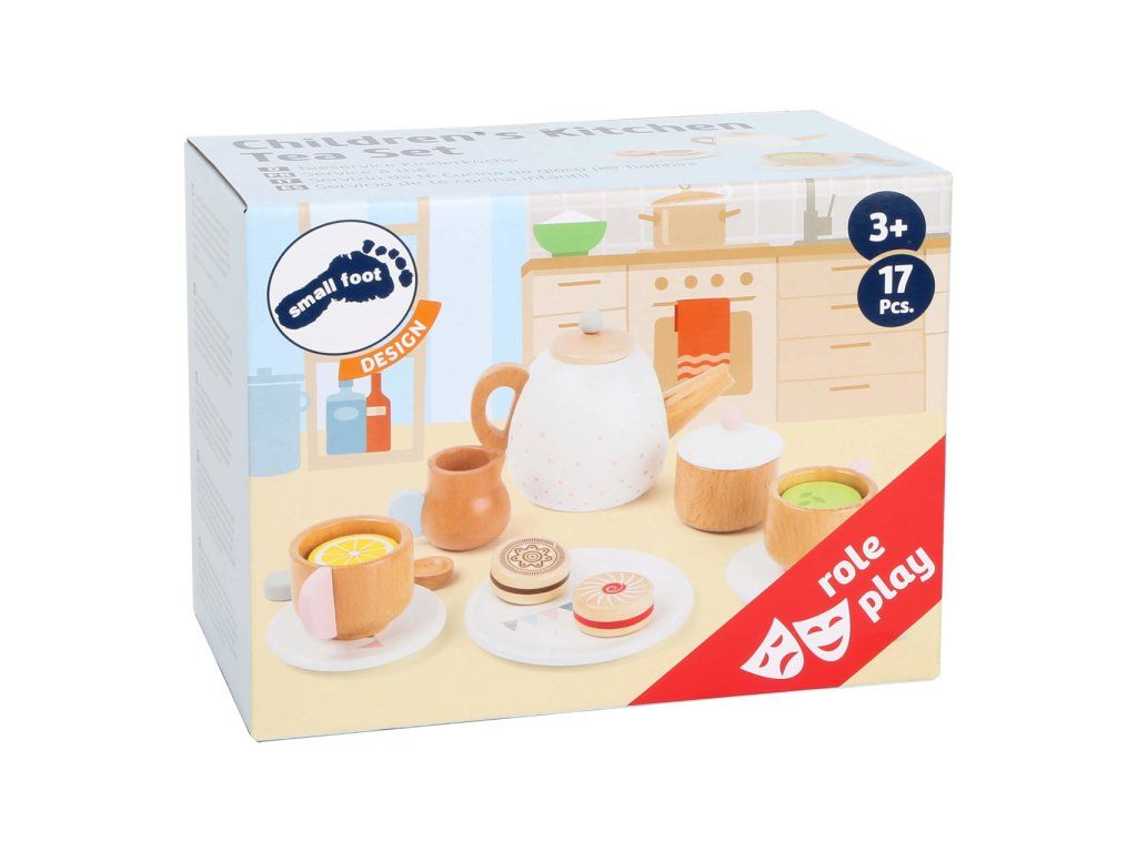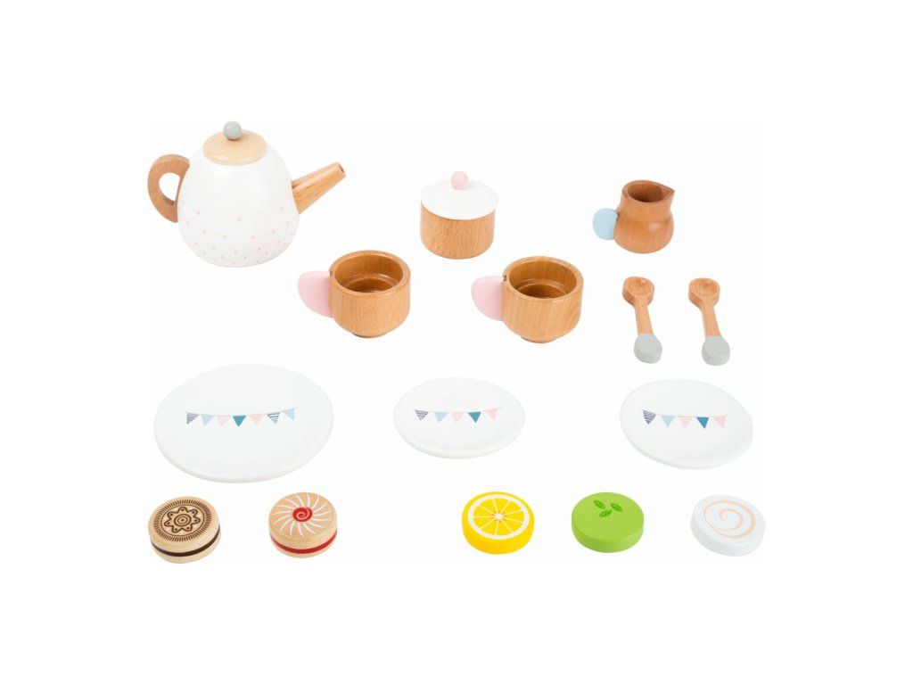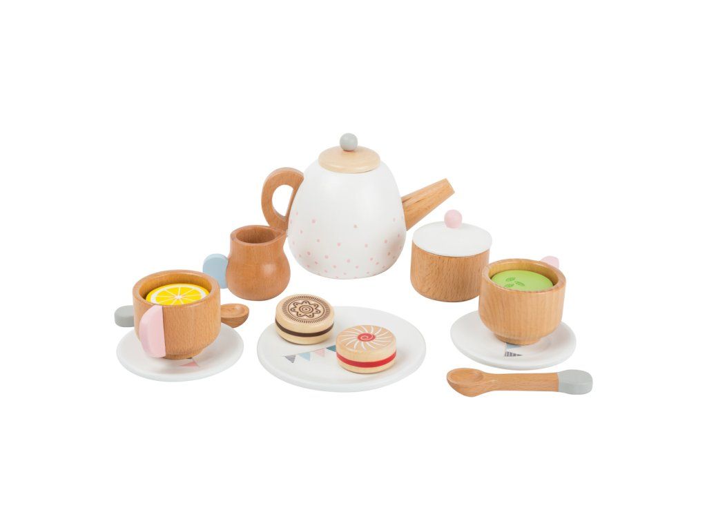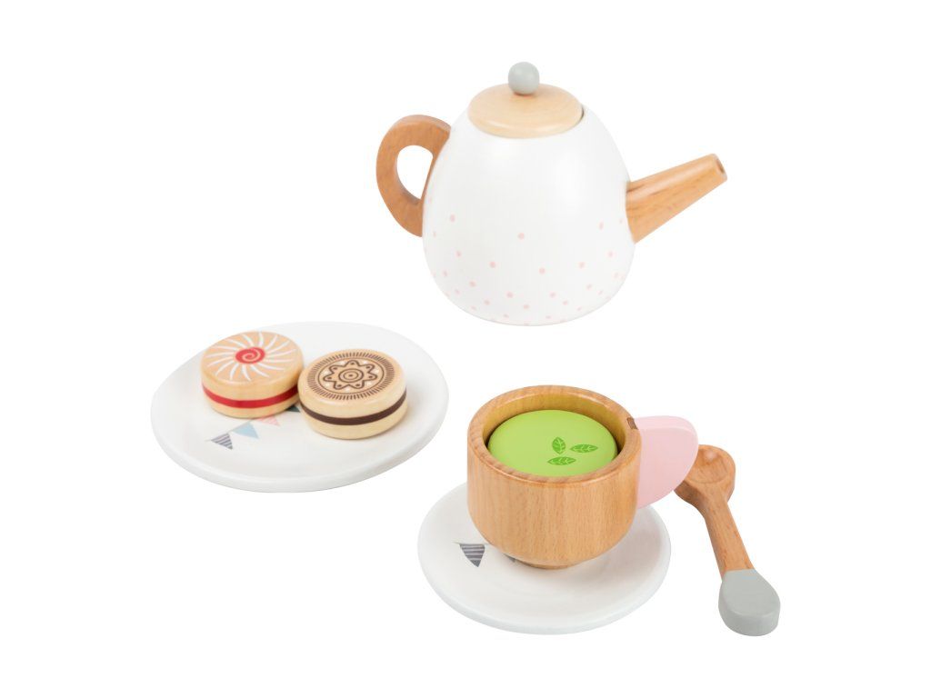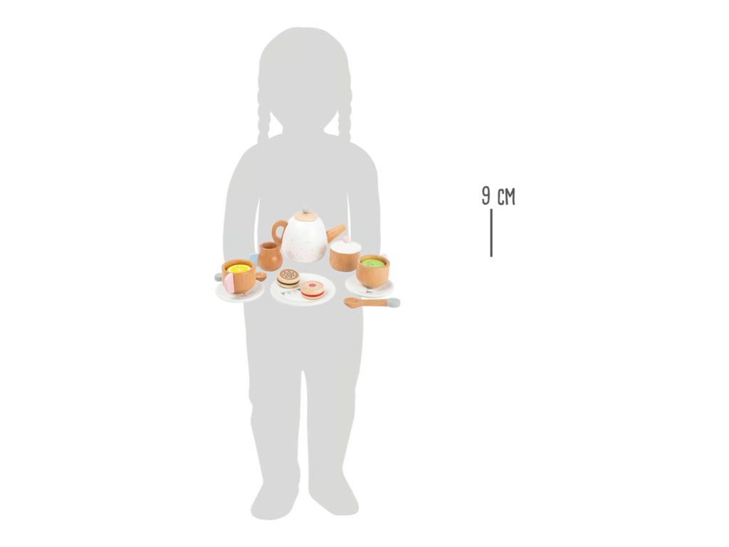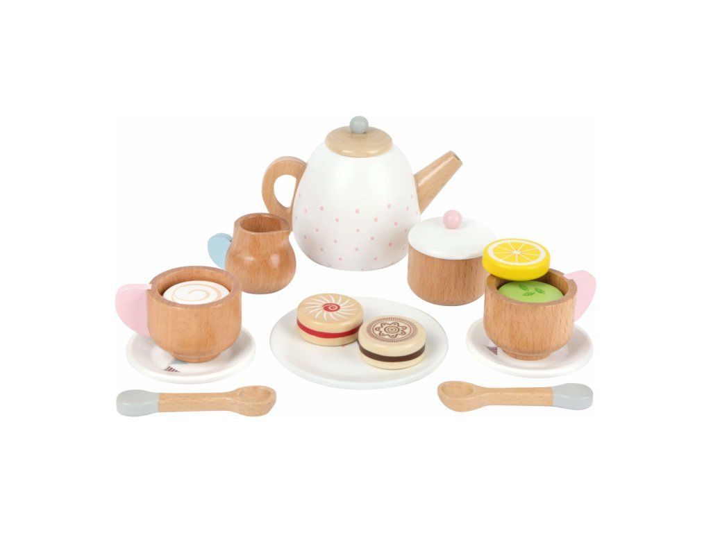 Máte chuť na lahodný čaj, nebo kávu se zákuskem? Zprostředkujte svým dětem možnost sehrát roli způsobných hostitelů, nechejte se obsloužit a vychutnejte si s nimi sladkou přestávku! S bohatou čajovou soupravou mohou děti rozvíjet fantazii, učit se pravidlům servisu a společenskému chování. Překvapí Vás pečlivým zpracováním z masivního dřeva, součásti jsou robustní a zvláště přizpůsobené dětským ručkám. Přírodní materiál dovedně přiznává a hravě kombinuje s jemnými pastelovými odstíny. Provedení klade důraz na detail, víčka konvičky i cukřenky jsou proto odnímatelná a hra může být ještě uvěřitelnější. Sadou můžete vhodně doplnit dětskou kuchyňku, stánek, nebo makety dezertů. Hlavní vlastnosti:konvička s víčkem, 2 šálky s podšálky a lžičkami, 3 různé kapsle náplní, mlékovka, cukřenka s víčkem, talířek a 2 makety sušenekatraktivní a robustní provedení z masivního dřevaDoplňkové parametry