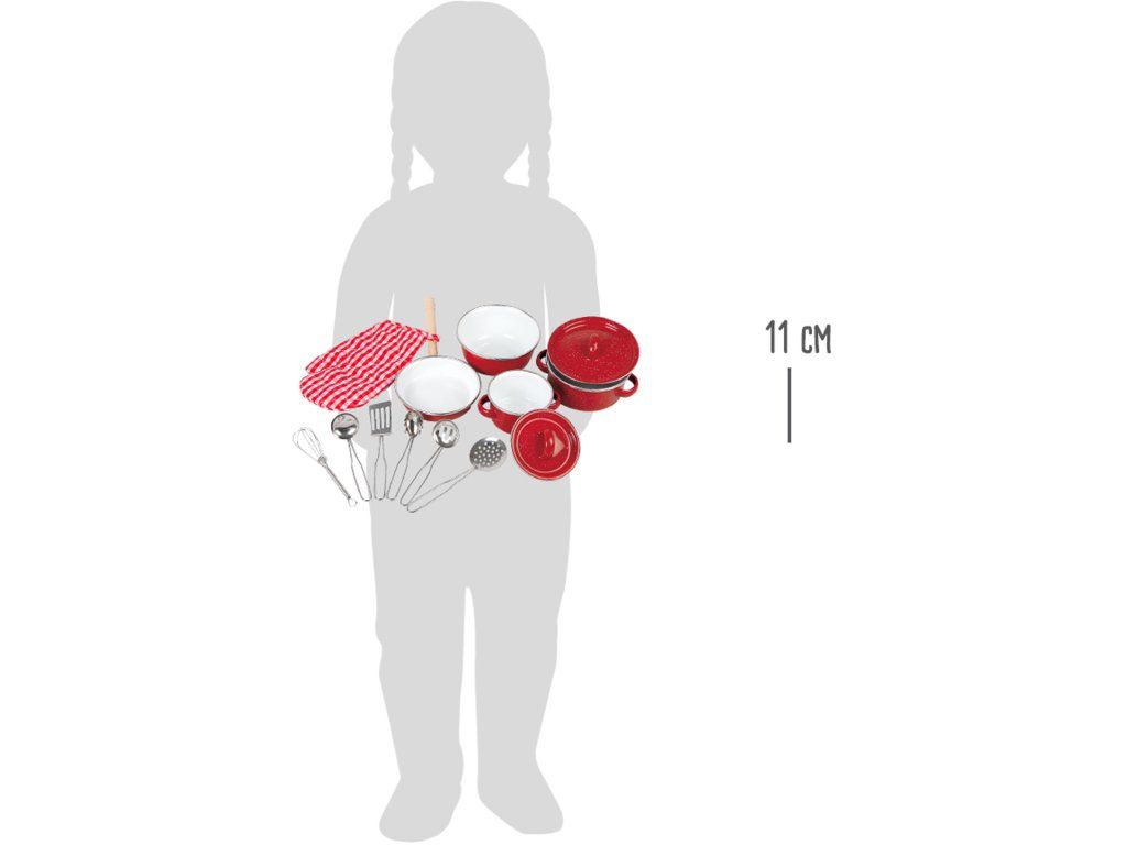 Perfektní začátečnická sada pro začínající mladé kuchaře, kteří rádi připravují lahůdky. S touto sadou v jasně červené barvě s různými kuchyňskými potřebami, jako je hrnec, pánev, chňapka, či jiné kuchyňské pomůcky, se každé dítě stane mistrem kuchařem. Ideální pro rodičovské a dětské interaktivní hry a skvělý způsob, jak podpořit kreativní a nápadité hraní. Sada obsahuje: 1 chňapka1 velká pánev s víkem1 malá pánev s víkem1 pánev, 1 pánev1 metla1 naběračka na polévku1 štěrbinová naběračka1 špachtle1 štěrbinová lžíce1 lžíce na těstoviny Hlavní vlastnosti: obsahuje 11 dílůpodporuje kreativitu a nápaditostrozvíjí sociální dovednostizlepšuje obratnost a motorikuDoplňkové parametry