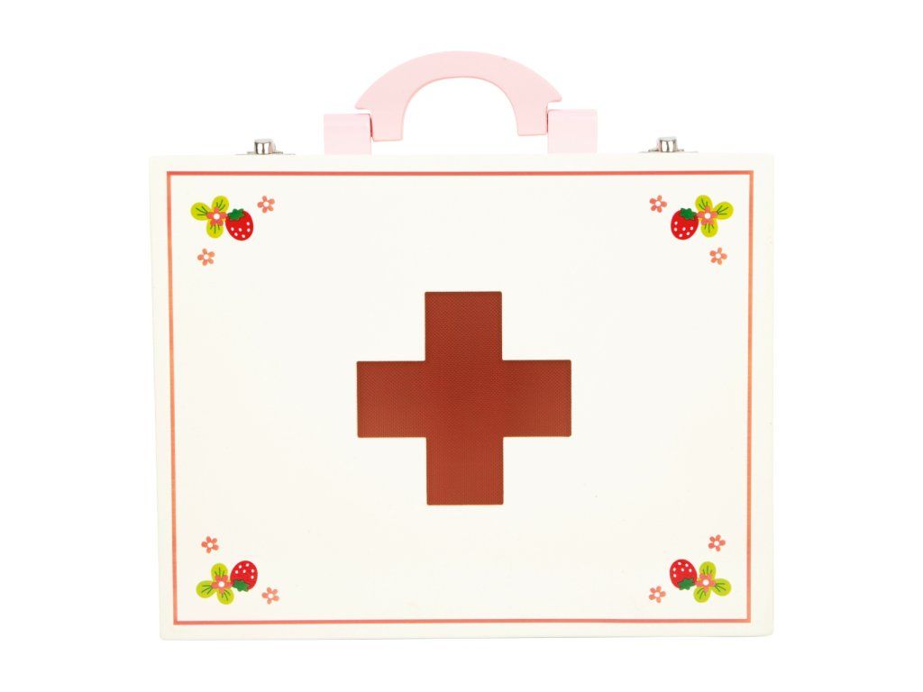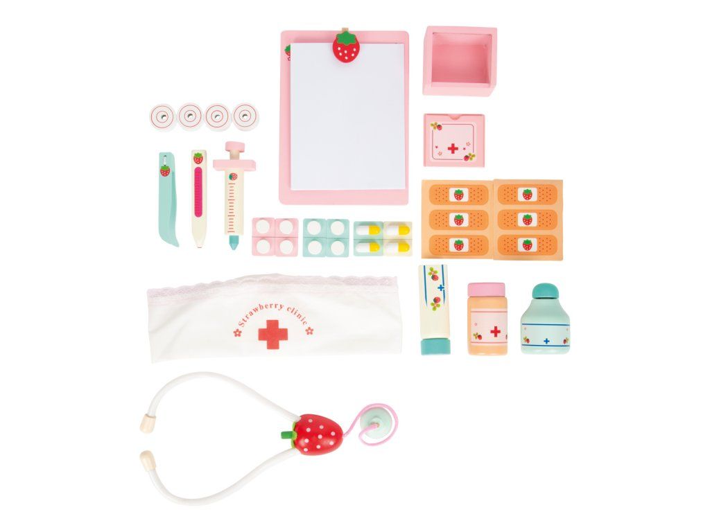Dřevěný barevný kufřík pro malou ošetřovatelku obsahuje 24 kusů různobarevného dřevěného příslušenství včetně textilní čelenky s červeným křížem. Kufřík obsahuje vše co každý doktor potřebuje - teploměr, stetoskop, injekční stříkačku, masti, léky... Vše vyrobené ze dřeva. Motiv jahody na jednotlivých nástrojích doplňuje veselý design. Hlavní vlastnosti: obsahuje 24 ks lékařských nástrojů a pomůcek podporuje kreativitu a komunikaciDoplňkové parametry