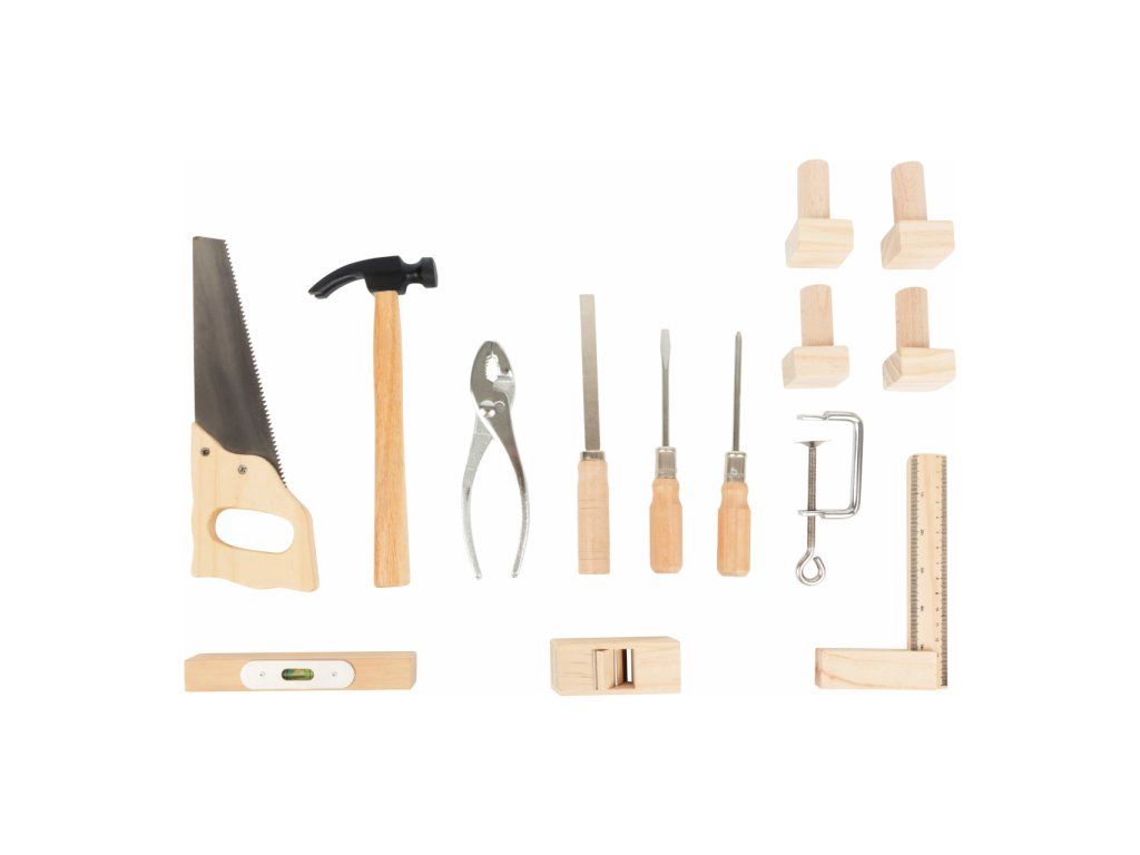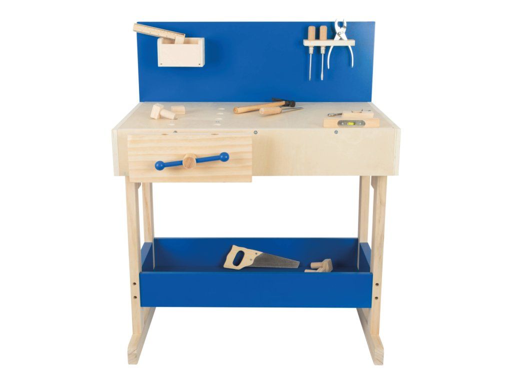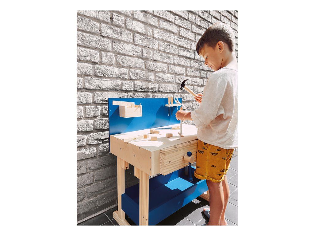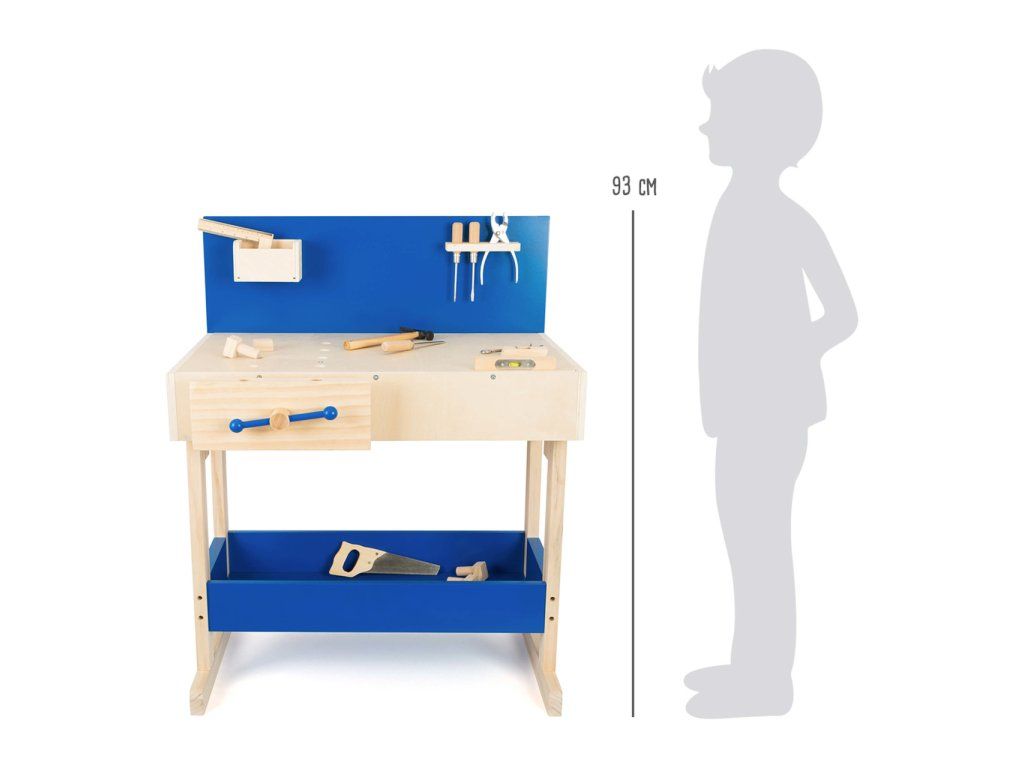 Dřevěný ponk vyrobený z masivu s policemi v modré barvě. Pod pracovní deskou, kterou lze přizpůsobit výšce dítěte, je úložná police na nářadí. Zadní stěna ponku je opatřena praktickým držákem na nářadí a úložnou přihrádkou pro drobné součástky. Nářadí je svými rozměry vhodné pro malé kutily. Je vyrobeno z pevného dřeva a kovu a je tak skutečně funkční. Pro nadšené malé kutily bude tento ponk inspirací k tvorbě a poznávání nářádí, materiálů a výrobních technologií. V neposlední řadě si kutilové prohloubí manuální zručnost. Hlavní vlastnosti: robustní kostrukce14 ks příslušenstvívýškově nastavitelná velká pracovní plochanabádá ke kreativní hřevhodné pro praváky i levákyDoplňkové parametry