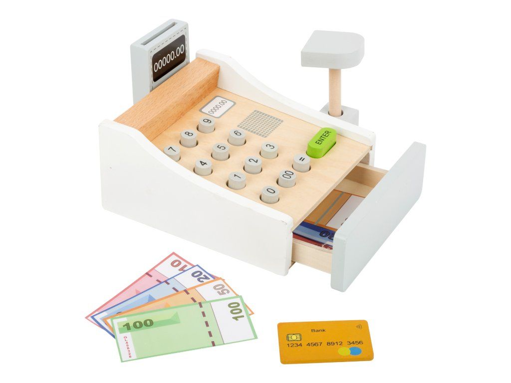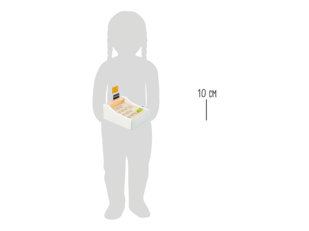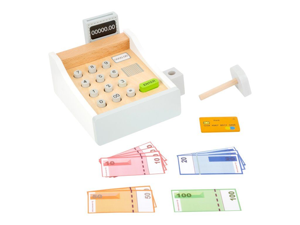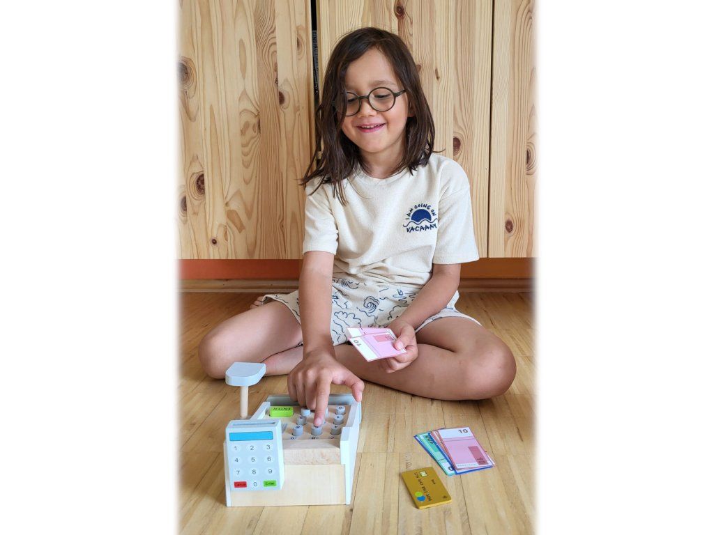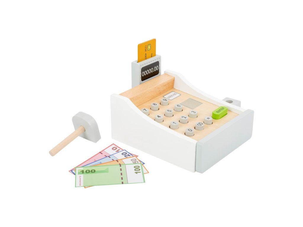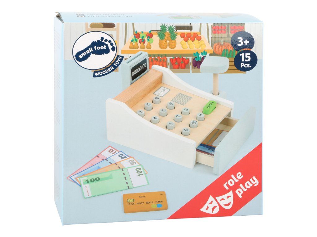 Peníze se jen sypou! Tato krásná dřevěná pokladna patří do každé dobře organizované dětské prodejny. Hraní s touto hračkou pomáhá dětem pochopit ceny zboží a manipulaci s penězi. Součásti jsou bankovky na hraní a dřevěné kreditní karty, které se pohodlně vejdou do spodní zásuvky. Cena zakoupeného zboží může být zadána na klávesnici. Kdo je další na řadě? Hlavní vlastnosti: dřevěná pokladna včetně skeneru, čtečky karet, hracích peněz a dřevěné kreditní kartyučí děti poznávat peněžní částky a cenyideální doplněk pro obchod na hranípodporuje aktivní hraní rolí a rozvoj sociálních dovedností dětí při hřeDoplňkové parametry