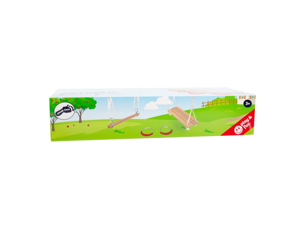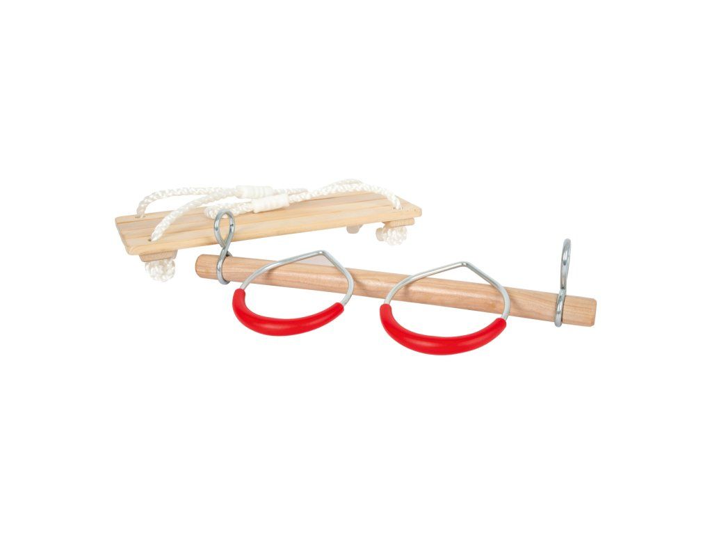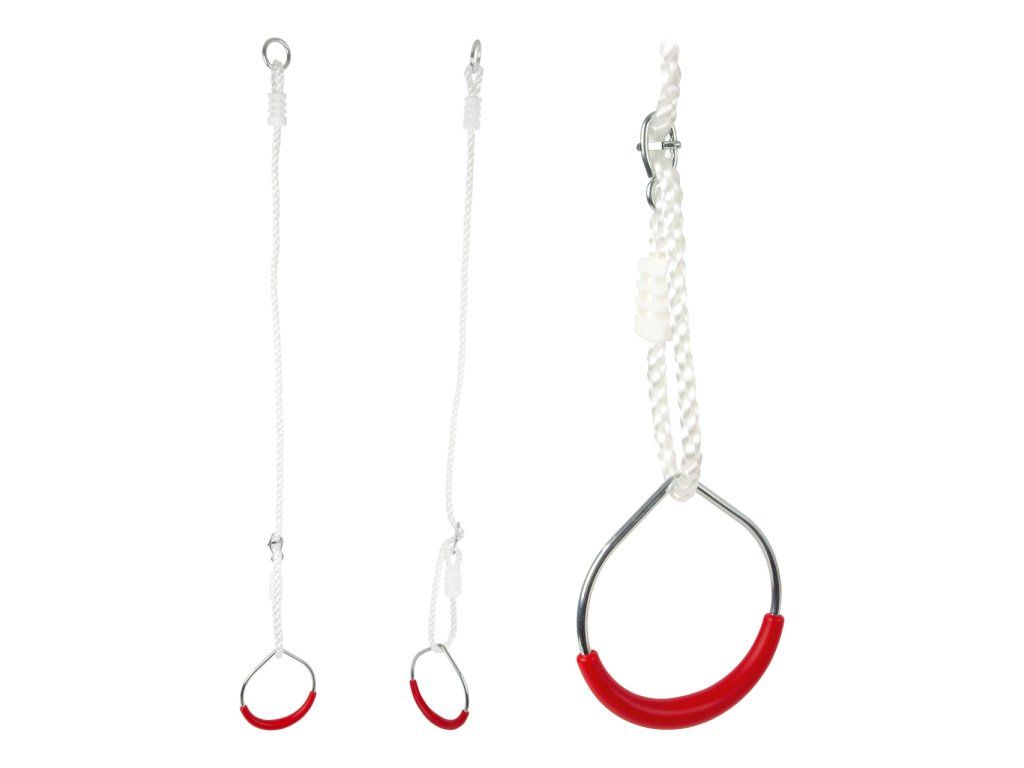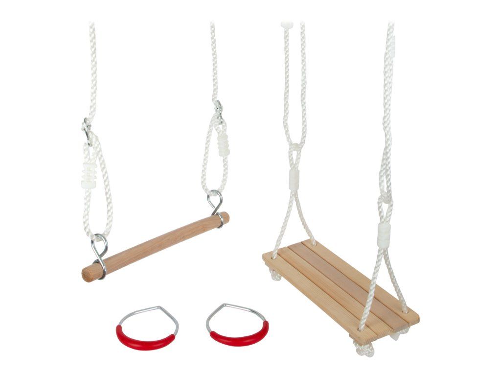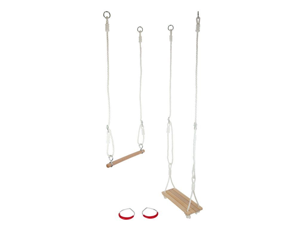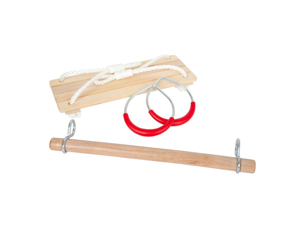 Zábava s houpačkami x3! S tímto setem houpaček, který se skládá z houpačky jednoduché, visuté hrazdy a kovových gymnastických kruhů s plastovými madly, děti zapomenou na význam slova nuda. V balení dvě sady lan, která jsou odolná proti přírodním vlivům, jsou nastavitelná díky lanové osmě. Pro každou houpačku tak můžete nastavit optimální výšku! Díky dvěma sadám lan můžete používat dvě houpačky zároveň. Jednoduché zavěšení. Praktická a multifunkční hračka do domu i na zahradu. Hlavní vlasnosti 4 nastavitelná lana3 typy houpačekGymnastické kruhy mají plastová madlaDoplňkové parametry