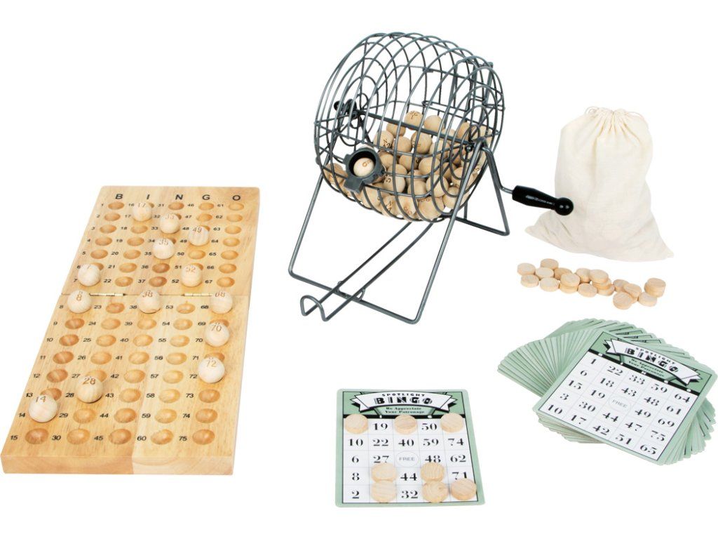 Bingo! Realistická hra bingo, kterou můžou hrát 1-4 hráči. Pravidla jsou stejná jako pro profesionály, výherní čísla se losují z kovového bubnu. Hra obsahuje 24 hracích karet, 75 dřevěných kuliček s čísly, 150 dřevěných krycích koleček a jednu hrací desku vyrobenou z velmi kvalitního dřeva, která je skládací. Otočte klikou a jedeme! Bingo je velmi jednoduché na vysvětlení a okamžitě hratelné. Hlavní vlastnosti: podporuje v rozvoji soustředění a komunikačních dovednostíoblíbená loterijní hra pro celou rodinu praktický úložný, textilní pytlíkflexibilní počet hráčůDoplňkové parametry