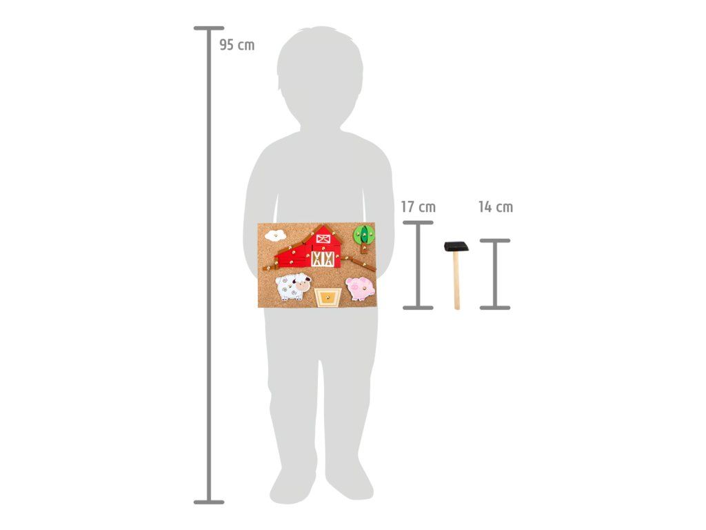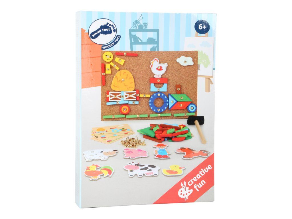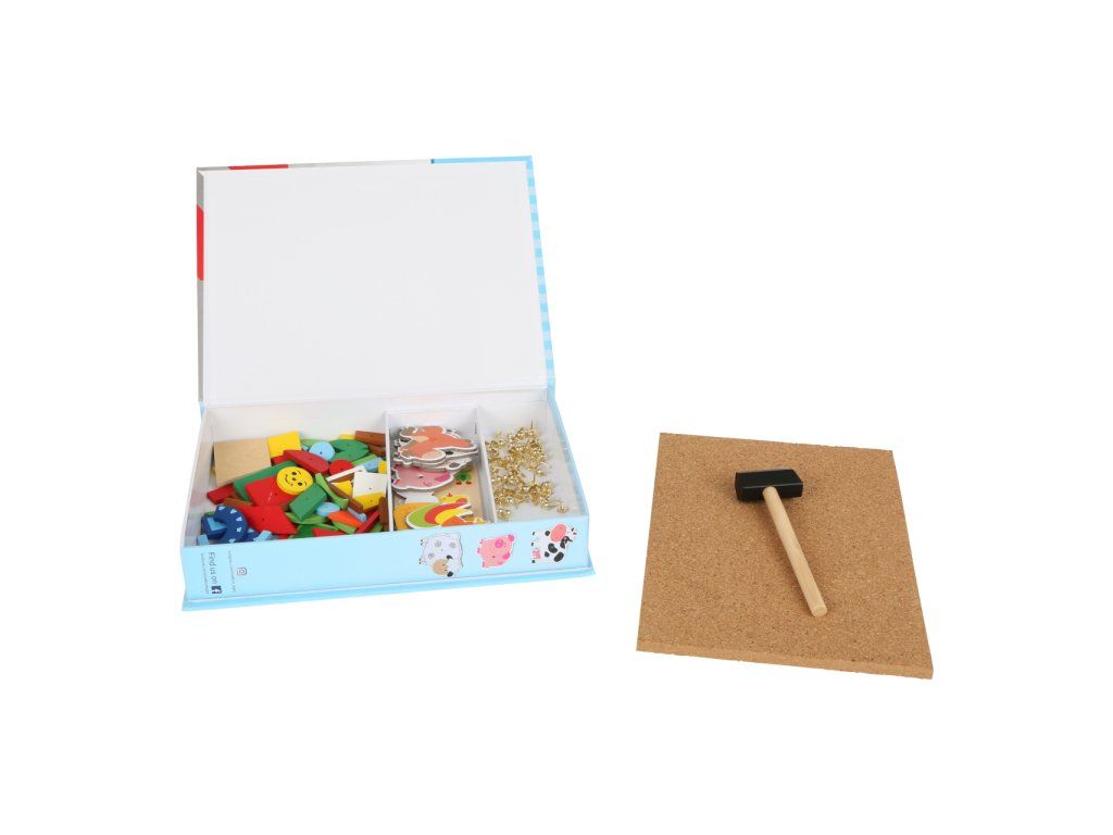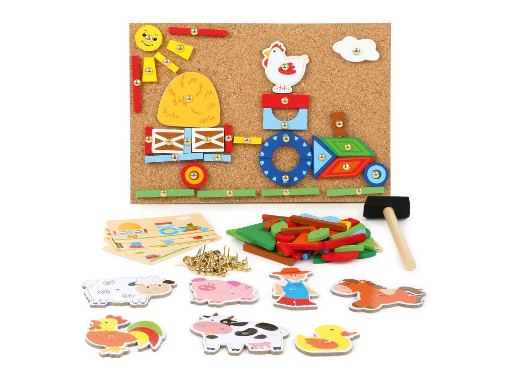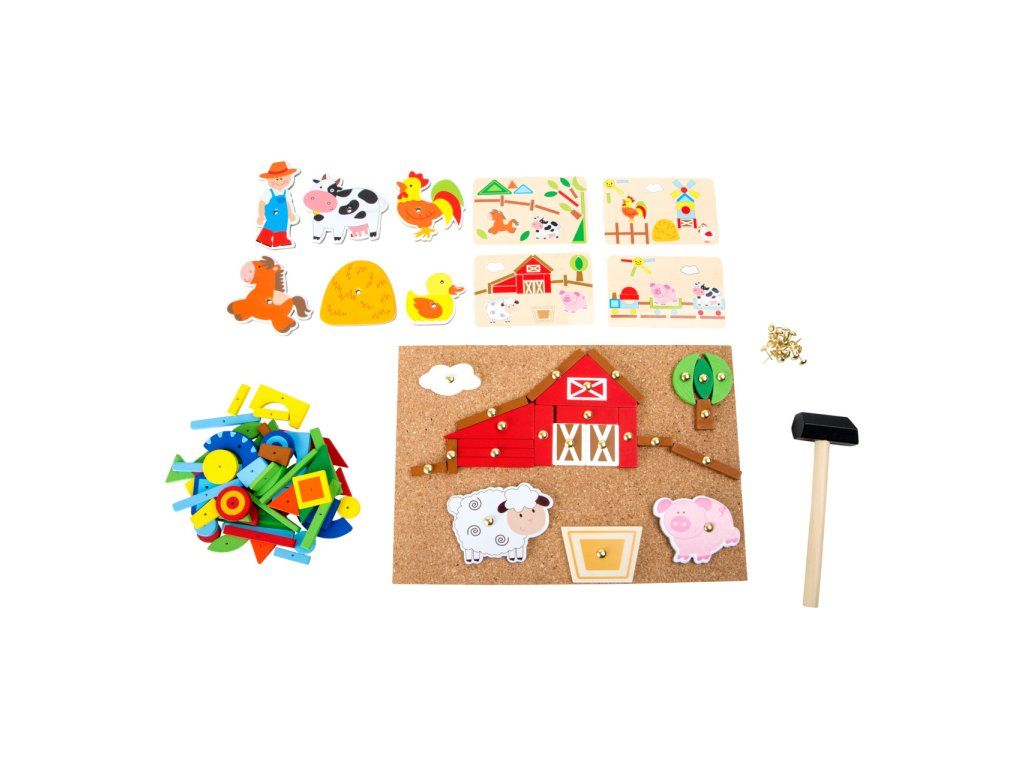 Tvůrčí zábava nikdy nekončí! S tímto kladívkem, dílky a korkovou deskou můžete vytvořit mnoho podob farmy. Čtyři vzorové karty navrhují motivy obrazu. Sada je balena v boxu a snadno se přepravuje. Hlavní vlastnosti: podporuje kreativitu a koncentracipodporuje jemnou motorikupraktický úložný boxDoplňkové parametry