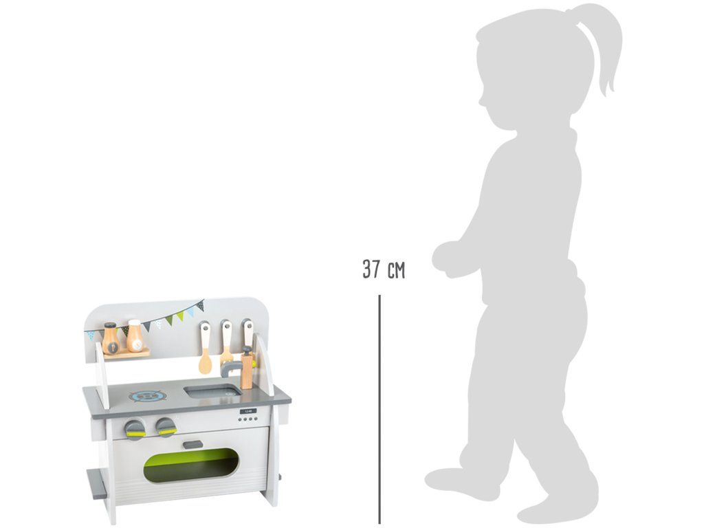 Vaření může začít! Tato kompletně vybavená kuchyňka vyrobená z FSC® 100% certifikovaného dřeva má vše, co mladí kuchaři potřebují pro přípravu hostiny. Trouba je vybavena vhodnými otvíracími dvířky. Na sporáku se nachází hrnec s odnímatelnou pokličkou. Solnička a pepřenka poskytují potřebné koření. Tuto kuchyň lze sestavit a rozebrat bez použití nářadí. Kdo by s touto kuchyňkou nechtěl vařit? Hlavní vlastnosti: kompaktní rozměry, součástí je příslušenstvíjednoduchý elelgantní design, který se hodí do jakéhokoliv pokojetrouba se zavírá a otevírá pomocí magnetu při točení knoflíků na sporáku se ozývá klikání Značka a certifikát FSC® (Forest Stewardship Council) zaručuje, že dřevo, ze kterého byl produkt vyroben, nebylo vytěženo nelegálně a pochází z lesů obhospodařovaných šetrným či přírodě blízkým způsobem, ve kterém jsou dodržovány přísné environmentální a sociální požadavky. Značka FSC® na výrobku znamená, že svým nákupem pomáháte chránit lesy a podporujete šetrné, odpovědné či přírodě blízké hospodaření, díky kterému jsou naše lesy stabilnější, zdravější, mají přirozenou druhovou skladbu a lépe odolávají negativním následkům klimatických změn.Doplňkové parametry