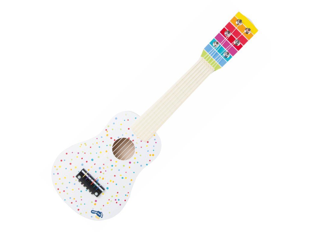 Tato kytara v bílé barvě s malými barevnými puntíky je nutnou výbavou pro všechny mladé milovníky hudby. Kytara je také nezbytnou součástí dětské kapely či herny. Může sloužit k naučení prvních akordů a citu pro rytmus. S pomocí malé kytary se mohou děti naučit doprovázet první říkanky a popěvky. Hlavní popis: děti se naučí akordy a hudební sluchDoplňkové parametry