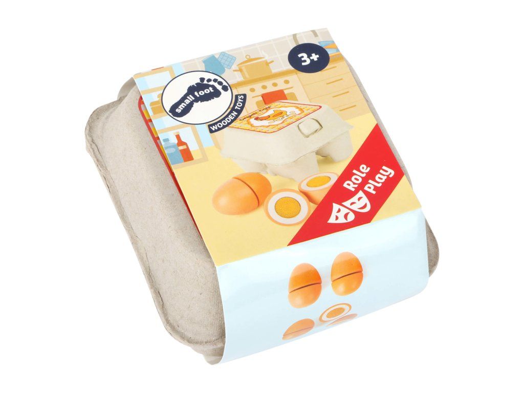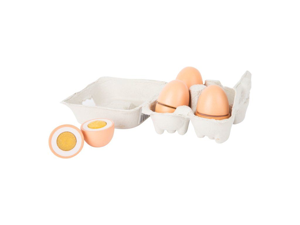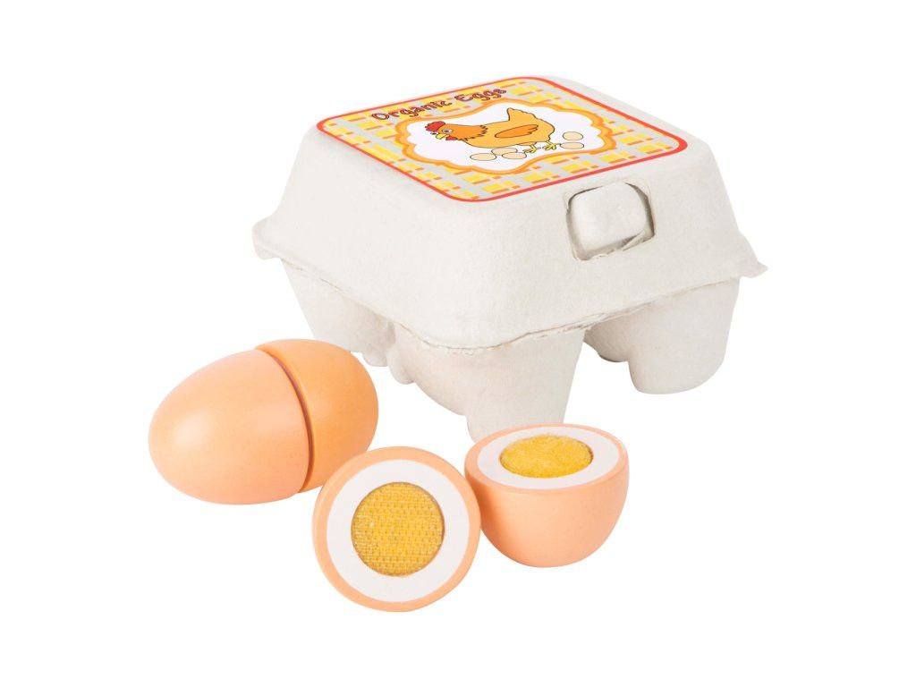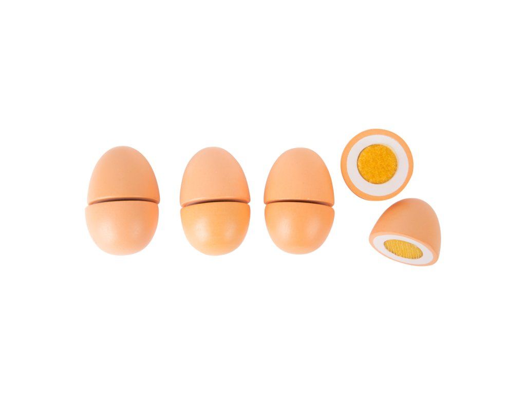 Tyto čtyři vajíčka vyrobená z robustního dřeva drží pohromadě díky suchému zipu a lze je oddělit dřevěným nožem. Karton na vejce je vyrobený z lepenky a zajišťuje tak bezpečnou přepravu. Vejce jsou vhodným doplňkem do dětské kuchyňky. Hlavní vlastnosti: spojené suchým zipemrozvíjí motoriku dětíDoplňkové parametry