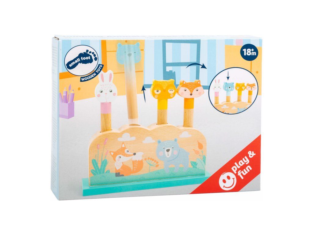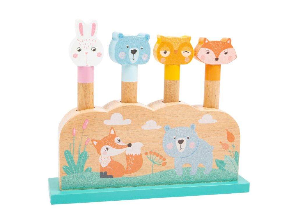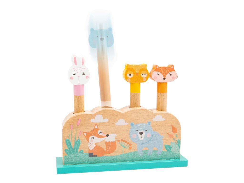 Kdo to tady poskakuje? Tato dřevěná vystřelovací hra má ilustraci v trendy pastelových barvách. Roztomilá lesní zvířátka vyrobená z robustního dřeva, která zasunete do otvorů v dřevěné základně. Tyto otvory v sobě mají pružiny, takže když zvíře do otvoru zatlačíte, rychle vyskočí nahoru a ven. Skvělá dřevěná hračka, která trénuje motoriku dětí. Díky základně je také velmi stabilní. Hlavní vlastnosti: trénuje motoriku dětív trendových pastelových barváchDoplňkové parametry