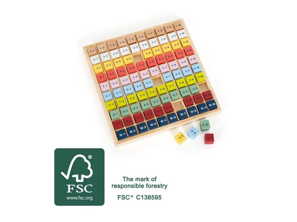 Barevná zábava s počty! Tato hra děti podpoří v procvičování násobení. Pomůcka je vyrobená z robustního 100% FSC® certifikovaného dřeva, je barevná a odolná. Děti uvede do světa násobků čísel. Kolik je 3x3? Hlavní vlastnosti: barevné dílky100% FSC® dřevotrénuje zručnost, počty Značka a certifikát FSC® (Forest Stewardship Council) zaručuje, že dřevo, ze kterého byl produkt vyroben, nebylo vytěženo nelegálně a pochází z lesů obhospodařovaných šetrným či přírodě blízkým způsobem, ve kterém jsou dodržovány přísné environmentální a sociální požadavky. Značka FSC® na výrobku znamená, že svým nákupem pomáháte chránit lesy a podporujete šetrné, odpovědné či přírodě blízké hospodaření, díky kterému jsou naše lesy stabilnější, zdravější, mají přirozenou druhovou skladbu a lépe odolávají negativním následkům klimatických změn.Doplňkové parametry