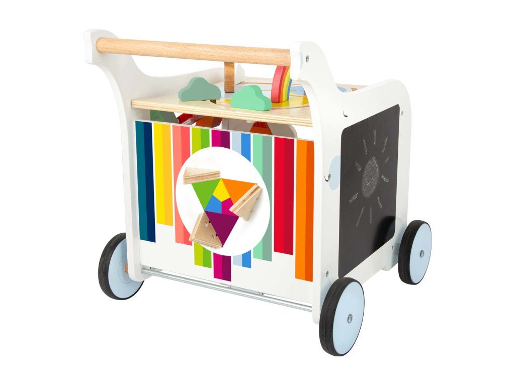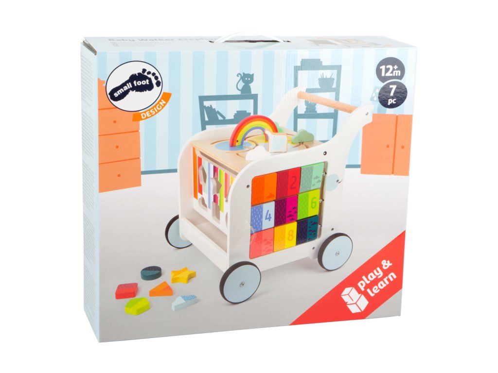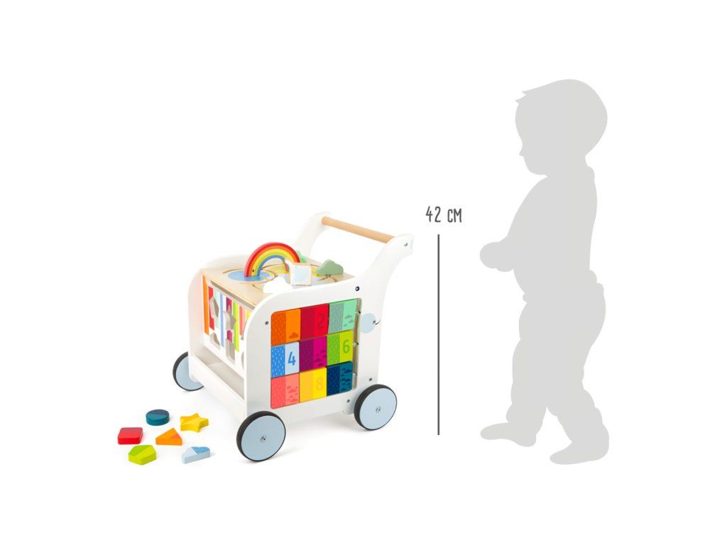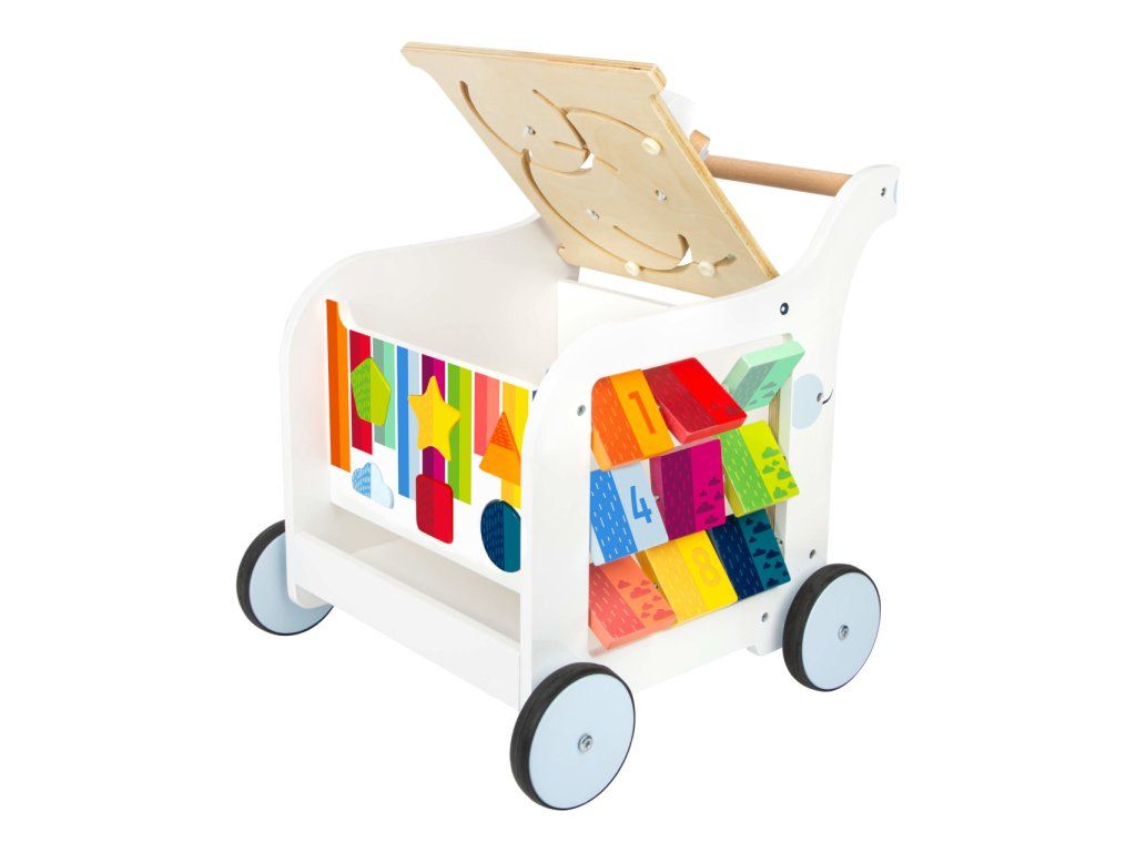 Chodítko ve tvaru slona je multifunkčním doplnkěm pro hru i výuku, přináší zábavu na všech svých pěti stranách! Děti se mohou zabavit duhovým labyrintem, vkládačkou s různými tvary, kreslením na tabulku, nebo otáčením a odklápěním různobarevných prvků. Svrchní desku s labyrintem lze odklápět, je vybavená výřezy bránícími skřípnutí dětských prstů. Odklopením odhalíte objemný úložný prostor na hračky, nebo oblíbeného plyšáka. Kola vozítka jsou opatřena pogumováním, které zajišťuje kultivovaný, tichý chod na všech typech povrchů. Jsou také vybavena brzdou, kterou můžete seřídit rychlost a oporu dle věku a pohybových schopností Vašich dětí. Výrobek vyžaduje montáž, dodáváno s obrázkovým návodem k sestavení. Hlavní vlastnosti: multifunkční chodítko a 6 dílků vkládačkyvkládačka, bludiště, otáčivé kostky, odklápěcí trojúhelník a tabulka pro kreslení křídoupraktický úložný prostortichý chododolné dřevěné provedeníDoplňkové parametry