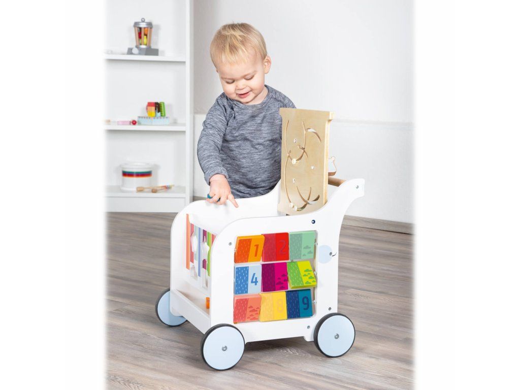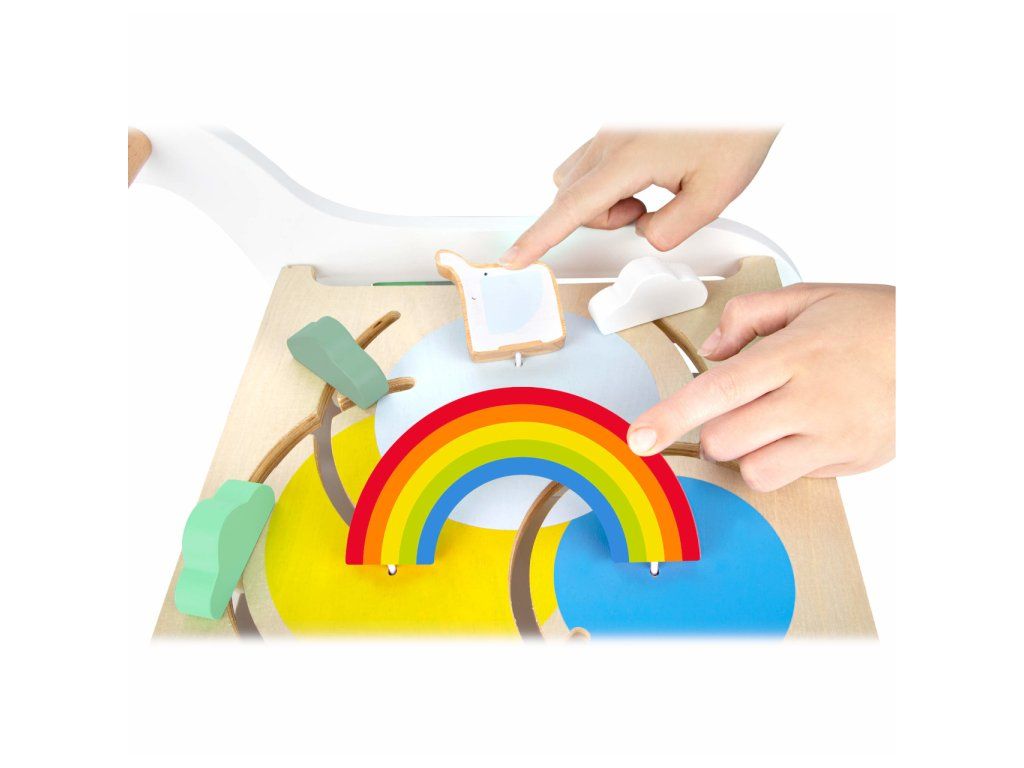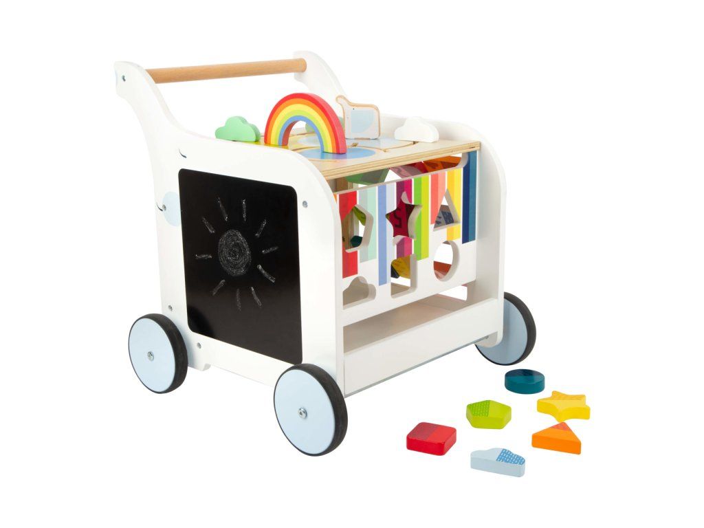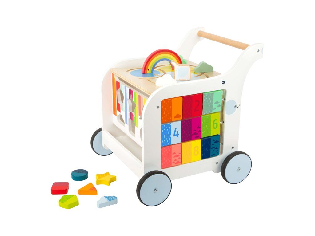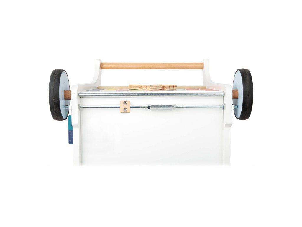 Chodítko ve tvaru slona je multifunkčním doplnkěm pro hru i výuku, přináší zábavu na všech svých pěti stranách! Děti se mohou zabavit duhovým labyrintem, vkládačkou s různými tvary, kreslením na tabulku, nebo otáčením a odklápěním různobarevných prvků. Svrchní desku s labyrintem lze odklápět, je vybavená výřezy bránícími skřípnutí dětských prstů. Odklopením odhalíte objemný úložný prostor na hračky, nebo oblíbeného plyšáka. Kola vozítka jsou opatřena pogumováním, které zajišťuje kultivovaný, tichý chod na všech typech povrchů. Jsou také vybavena brzdou, kterou můžete seřídit rychlost a oporu dle věku a pohybových schopností Vašich dětí. Výrobek vyžaduje montáž, dodáváno s obrázkovým návodem k sestavení. Hlavní vlastnosti: multifunkční chodítko a 6 dílků vkládačkyvkládačka, bludiště, otáčivé kostky, odklápěcí trojúhelník a tabulka pro kreslení křídoupraktický úložný prostortichý chododolné dřevěné provedeníDoplňkové parametry