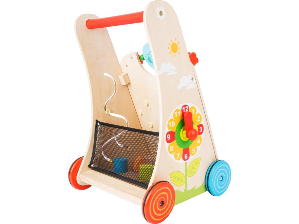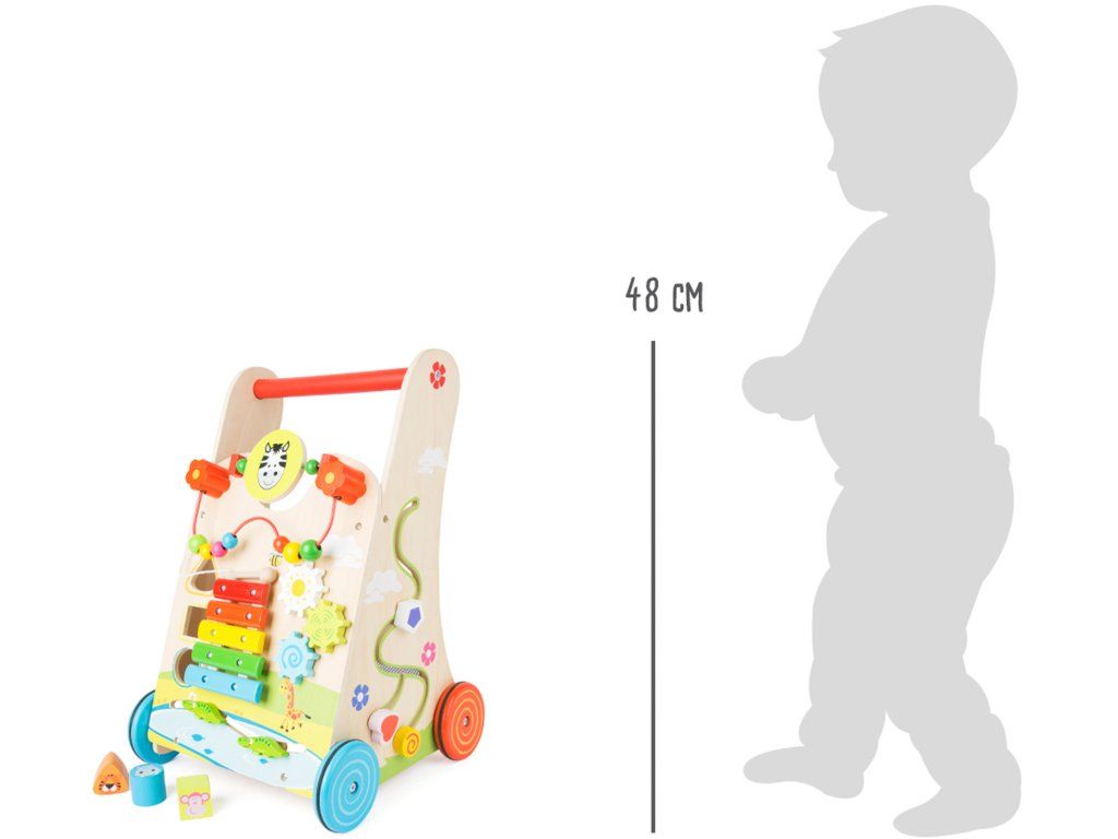 Aktivní ze všech stran! Toto stabilní dětské chodítko poskytuje vše, co malí průzkumníci potřebují k objevování svého světa všemi smysly. Na chodítku naleznete mnoho interaktivních prvků jako je xylofon s 5 klávesami, hodiny, labyrint, hlavolam, vkládačku s tvarovanými kostkami. Dno chodítka lze použít jako úložný prostor nebo pro převoz plyšáků. Kola jsou opatřeny gumovým proužkem pro tichý chod na hladkých podlahách. Báječný pomocník při prvních krůčcích. Hlavní vlastnosti: multifunkčnostrobustní rukojeťpestrobarevná kolečkaDoplňkové parametry