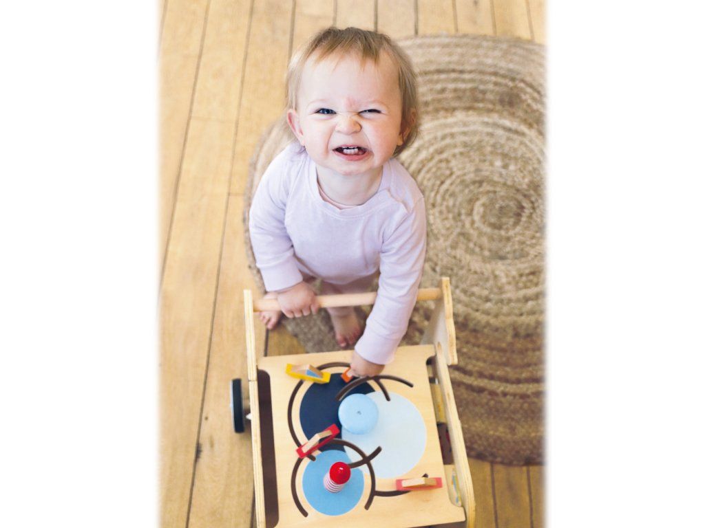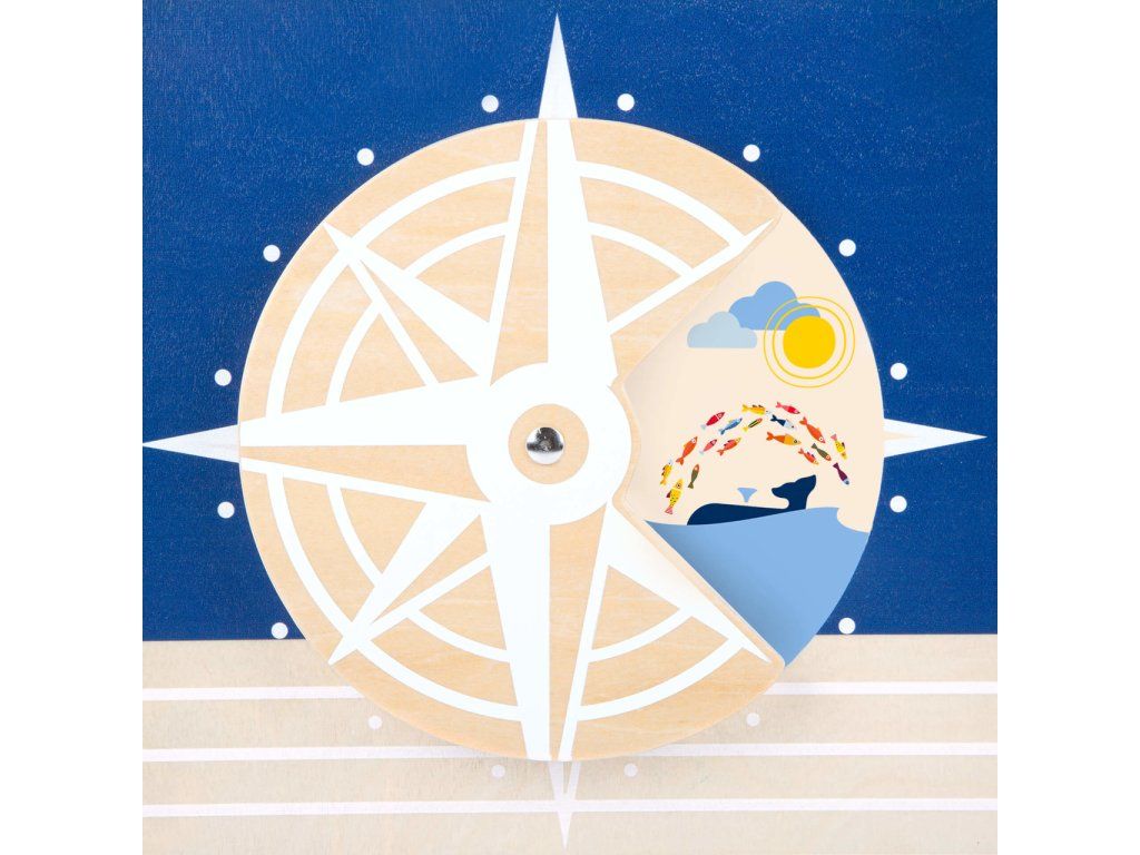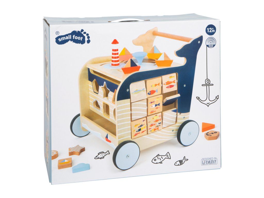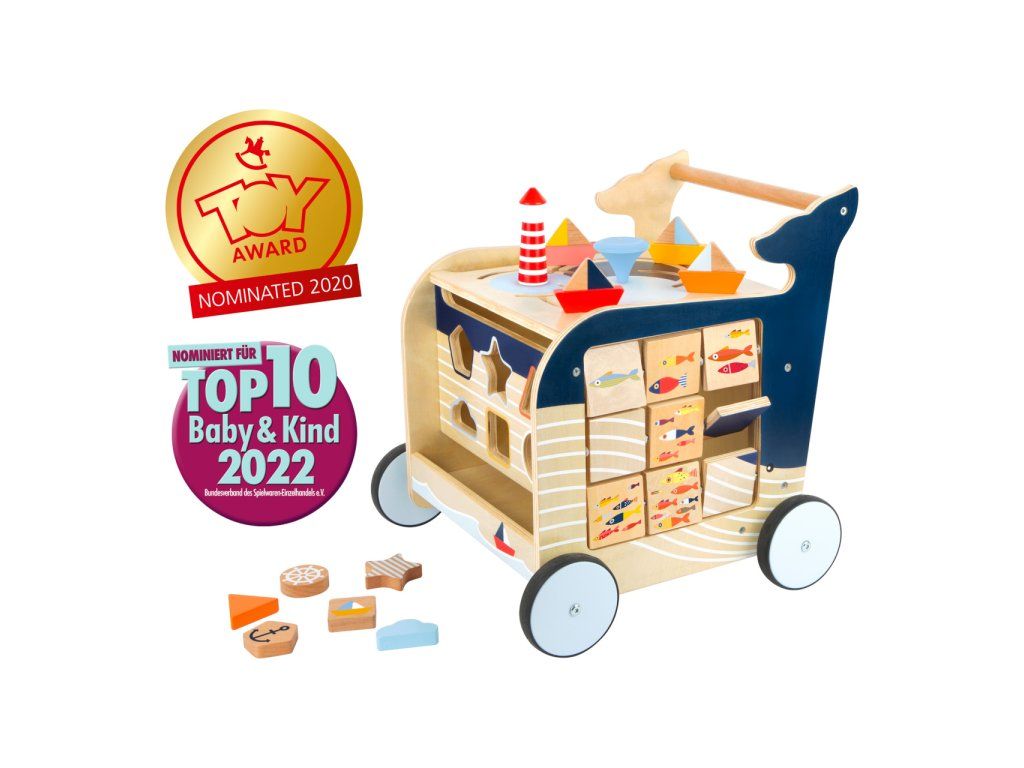 Pojďme na průzkum s velrybou! Toto dřevěné chodítko ve tvaru velryby pomůže dětem s prvními kroky a zároveň nabídne hračky k rozvoji motoriky. Chodítko se drží stylu mořského světa a jeho živočichů. Na čtyřech stranách chodítka naleznete hry jako vkládání tvarů, otáčení obrázků nebo kreslící tabulku. Děti se mohou naučit počítat, určovat světové strany nebo rozlišovat roční období. Chodítko má pogumovaná kola a je tak tiché a zároveň bezpečné. Chodítko je nahoře otevíratelné a dvířka obsahují pojistku proti přivření prstů. Můžete do něj tedy uložit všechny kostky. Najdete zde i brzdný systém, který zabrání nehodám. Hlavní vlastnosti: multifunkční hračkapodporuje hravost a rozvoj motorikyDoplňkové parametry