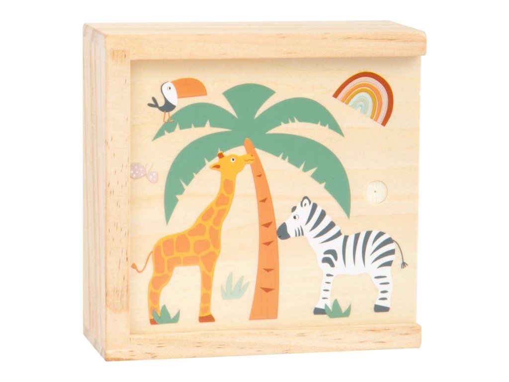 Safari přímo v dětském pokojíku! Abyste našli všech 14 dvojic obrázků budete potřebovat dobrou pamět a soustředěnost. Malé dřevěné dílky s krásnými ilustracemi safari v trendy barvách upoutají pozornost každého dítěte. Budou se chtít dozvědět více o tomto zvířecím světe. Nejen, že si děti při hraní pexesa procvičí pamět, ale také se naučí pojmenovat nová zvířata. Pexeso je uloženo v dřevěném boxu, takže je perfektní i na cesty. Hlavní vlastnosti: klasická paměťová hra s motivy z říše zvířathra pro 2 – 4 hráčeideální na cesty: lze snadno uložit do dřevěné krabičky s posuvným víkemhravou formou trénuje soustředění a paměťové schopnostidděti se při hře učí o obyvatelích savanyDoplňkové parametry