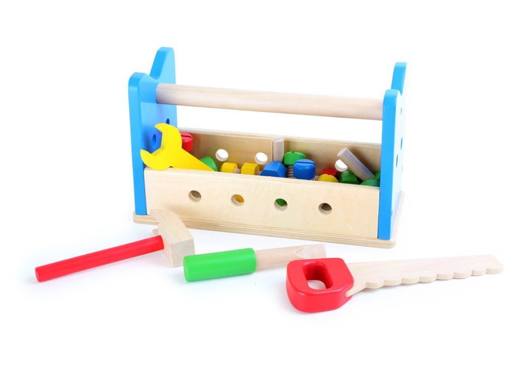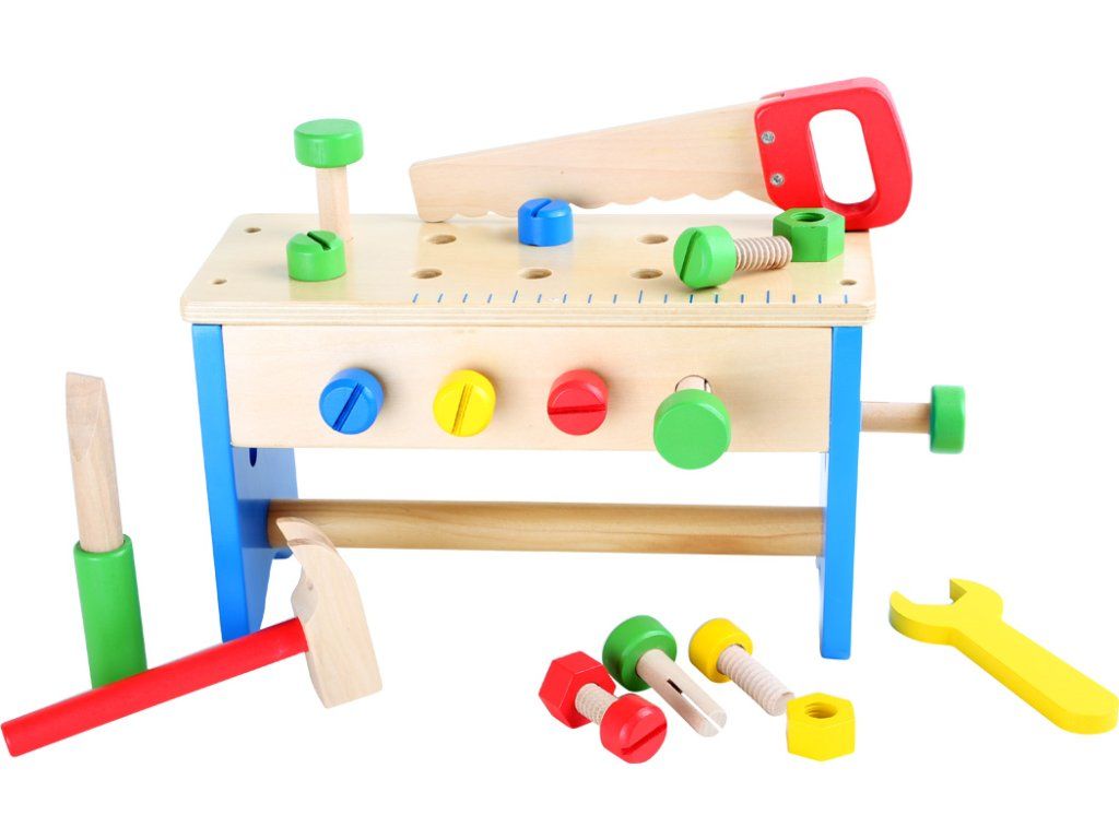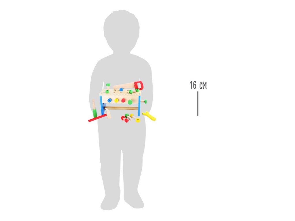Můžete zde řezat, zatloukat a šroubovat. Tento barevný pracovní stůl se v mžiku promění v box na nářadí, a tak můžete veškeré nářadí ze světlého dřeva rychle uložit. Šroubovák, klíč, kladivo, pilu, šroubky a matky lze do boxu uložit a díky praktickému madlu je vzít všude s sebou. Co postavíme příště a kam to s sebou vezmeme? Hlavní vlastnosti: balení obsahuje 30 ks 2v1 – pracovní stůl a boxtrénuje jemnou motorikuDoplňkové parametry