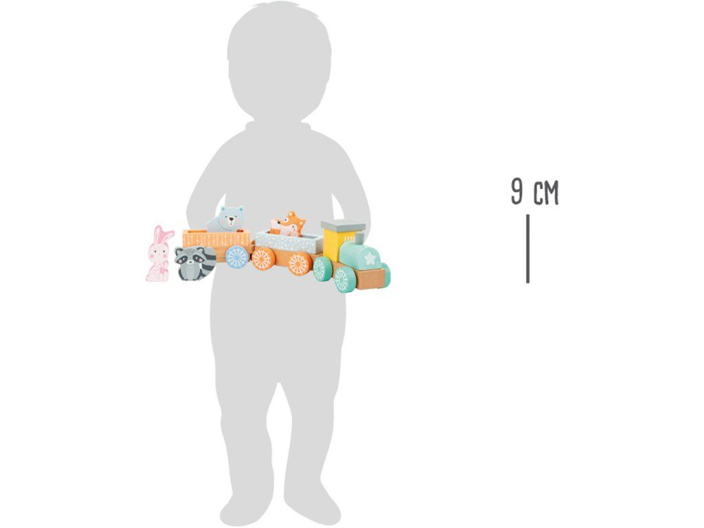 Hú, hú, přijíždí vlak! Tento vláček v pastelových barvách veze veselé pasažéry. Dva vagóny můžete jednoduše spojit. Malá lokomotiva se skládá z podvozku a dvou nasazovacích kostek. V balení také barevná liška, zajíc, mýval a medvěd, kteří už čekají na odjezd vlaku. Hlavní vlastnosti: 1 lokomotiva, 2 vagónyfigurky zvířátekdřevěná hračka v pastelových barváchDoplňkové parametry