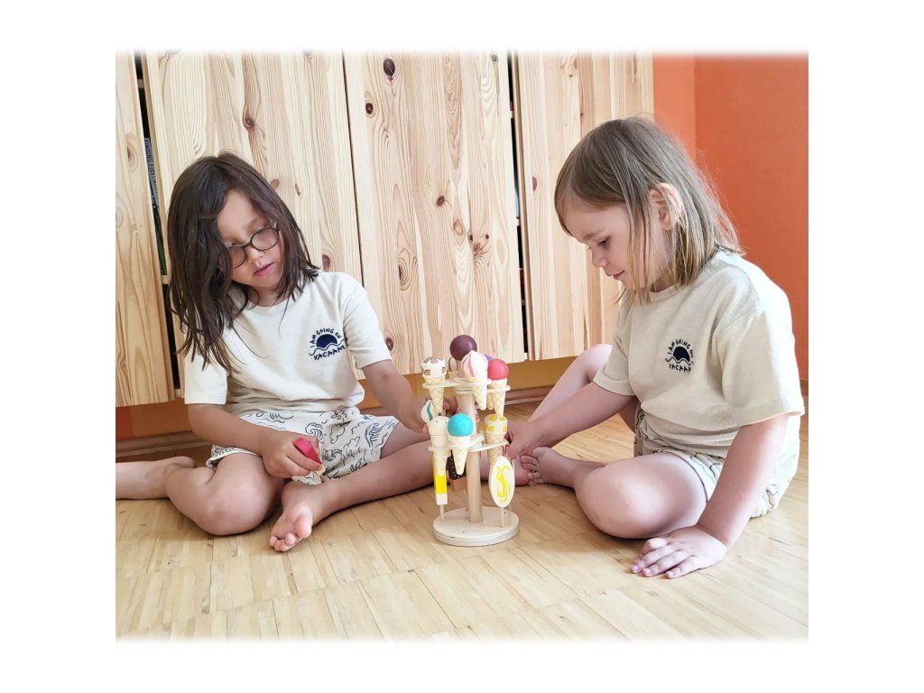 Z takové nabídky zmrzliny si vybere každý! S pomocí stojanu s mraženými sladkostmi mohou děti rozvíjet fantazii, poznávací a komunikační dovednosti. Podělí se s přáteli a rodiči? Nebo budou chtít zmrzlinu prodávat? Pak lze soupravou zpestřit některý z bohaté nabídky stánků a obchodů, nebo ji doplnit o jejich příslušenství, například pokladnu. Svou barevností zpestří každý dětský pokojíček. Zmrzliny v kornoutech lze vkládat do kruhových otvorů, které lze rozvinout kolem ústředního sloupku stojanu. Do děr v jeho podstavci lze pak usadit i rozmanité nanuky. Pro snadné přenášení je stojan na vrcholu opatřen robustní koulí. Všechny součásti jsou vyrobeny z kombinace masivního dřeva a silné překližky, hračka tak může nabídnout vysokou odolnost a životnost. Hlavní vlastnosti: 3 patrový stojan s 10 zmrzlinami a 5 nanukyvhodný doplněk stánků a obchodůsnadno přenosnýodolné dřevěné provedeníDoplňkové parametry