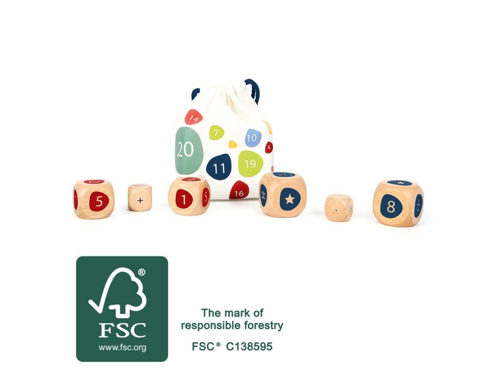 Pytlíček naplněný matematickými problémy. Obsahuje šest matematických kostek vyrobených ze 100% certifikovaného FSC® dřeva. Nabízejí nespočet kombinací matematických příkladů, sčítání, odčítání, násobení, dělení. Aritmetika náhodně, děti se tak nebudou nudit. Můžete ztížit úroveň počtů odebráním některých kostek. Hlavní vlastnosti: 6 matematických kostek v praktickém balenípočtem kostek lze ovlivnit obtížnostprocvičování matematických příkladů hravě Značka a certifikát FSC® (Forest Stewardship Council) zaručuje, že dřevo, ze kterého byl produkt vyroben, nebylo vytěženo nelegálně a pochází z lesů obhospodařovaných šetrným či přírodě blízkým způsobem, ve kterém jsou dodržovány přísné environmentální a sociální požadavky. Značka FSC® na výrobku znamená, že svým nákupem pomáháte chránit lesy a podporujete šetrné, odpovědné či přírodě blízké hospodaření, díky kterému jsou naše lesy stabilnější, zdravější, mají přirozenou druhovou skladbu a lépe odolávají negativním následkům klimatických změn.Doplňkové parametry