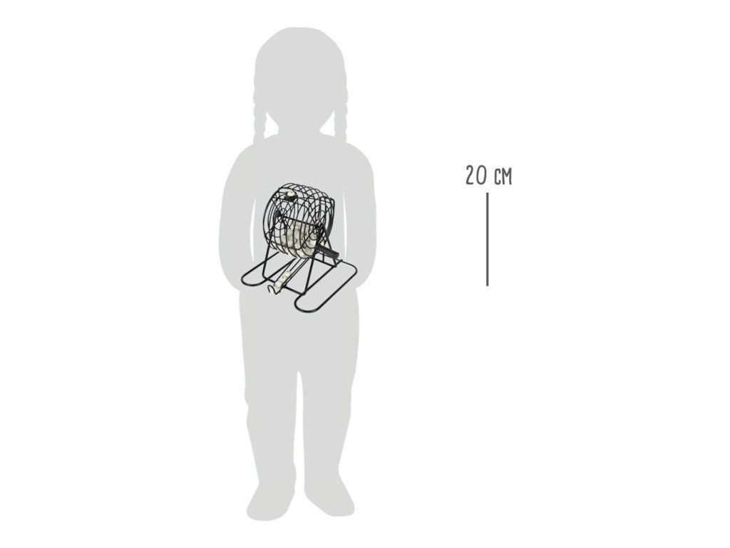 Klasická soutěžní hra "Bingo" s barevnými žetony, bílými kuličkami, plastovým zásobníkem a losovacím kovovým bubnem. Každý hráč si může vybrat svou vlastní barvu žetonů. Klika otáčí bubnem a jakmile se změní směr, první očíslovaná kulička spadne do přihrádky. Komu se podaří umístit správnou kombinaci jako první? Své štěstí si mohou zkusit jak malí, tak velcí hráči. Hlavní vlastnosti: obsahuje: barevné žetony, bílé kuličky, plastový zásobníklosovací buben je kovový děti se učí poznávat číslaDoplňkové parametry
