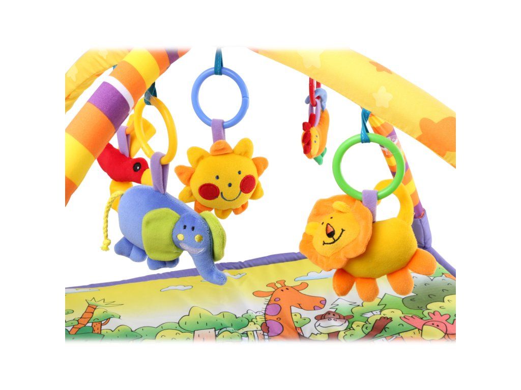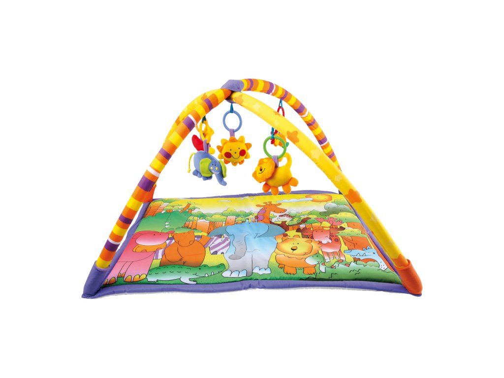 Kdo by nechtěl dovádět obklopený těmi nejroztomilejšími zvířátky! Příjemně měkká pestrobarevná podložka zdobená zvířecími motivy umožňuje nejmenším pohodlně ležet a hrát si s plyšovými hračkami pod klenbou z měkkých a pružných podpěr. Poutavé hračky různě chrastí, nebo pískají, přispívají tak k vývoji dětských smyslů a motoriky, motivují a postupně učí děti sedět. Jsou zavěšené na rozevíratelných kroužcích umožňujících jejich odepnutí, děti tak mohou mít své oblíbence vždy u sebe. Podložka je skladná a snadno rozložitelná, balená a dodáváná v praktické, snadno přesnosné plastové tašce. Hlavní vlastnosti: příjemně měkké, bezpečné a pohodlné provedení5 odnímatelných plyšových hračekzvukové efekty chrastění a pískánípraktické baleníDoplňkové parametry