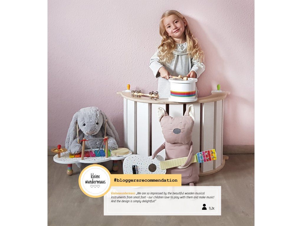 Hudba a tóny Vás zaručeně rozveselí! Tento pestrobarevný dřevěný komolý jehlan nabídne na svých třech stranách různé možnosti tvoření rytmických zvuků. Je zde chrastítko, mini xylofon a bubínek. Malý činel na vrcholku se rozezvučí zvonivým zvukem. Všestranná zvuková sada dává hudební show zelenou! Nejedná se o hudební nástroj, ale o hračku. Hlavní vlastnosti: 4 zvukové nástroje a paličkatrénuje sluch, jemnou motoriku a smysl pro rytmusDoplňkové parametry