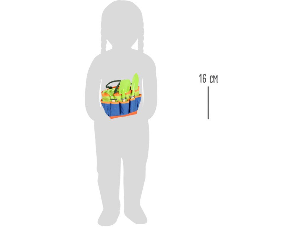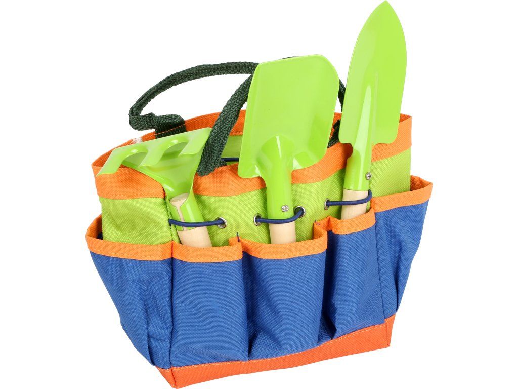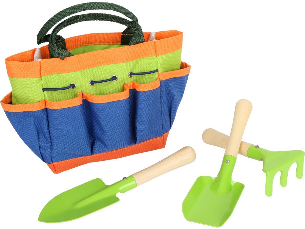 Přenosný set malých zahradníků. Tento velmi kvalitní zahradnický set obsahuje lopatku, motyku a rýč. Taška se dá jednoduše vyprat, nářadí omýt vodou. Nářadí je vyrobeno z masivního dřeva a kovu, velikostně tak akorát pro dětské ruce. Pojďme na zahradu! Taška s nářadím má 16cm na výšku. Hlavní vlastnosti: Ideální velikost pro děti Rozvíjí motoriku a vztah k přírodě Vyrobeno z kovu, dřevěná násadaDoplňkové parametry