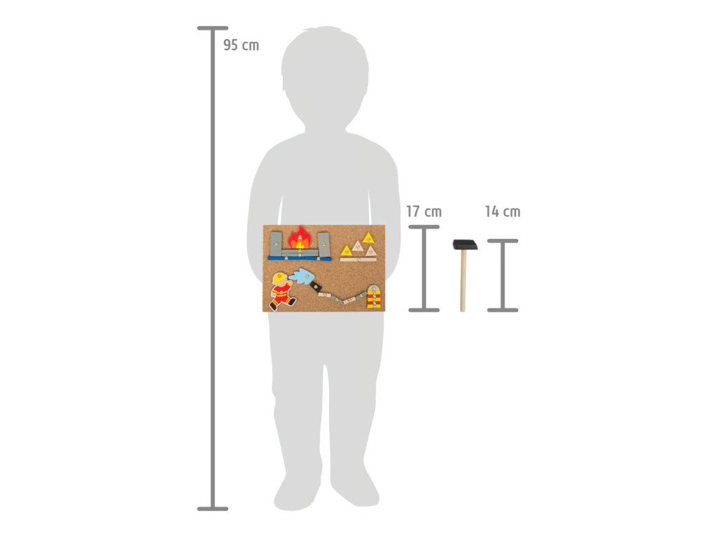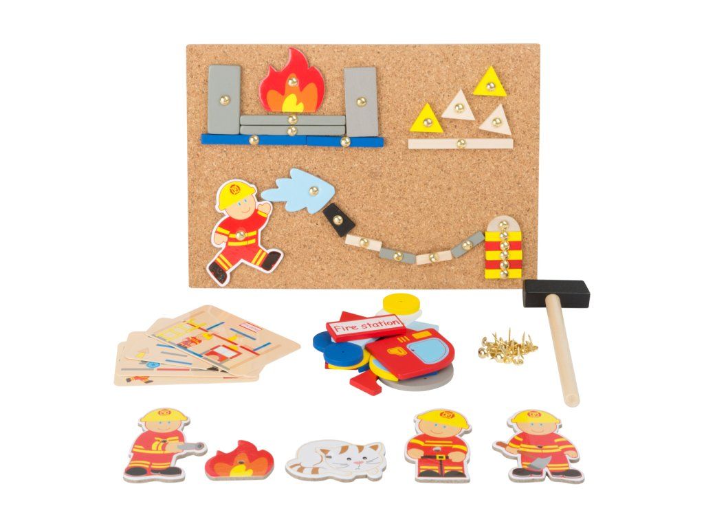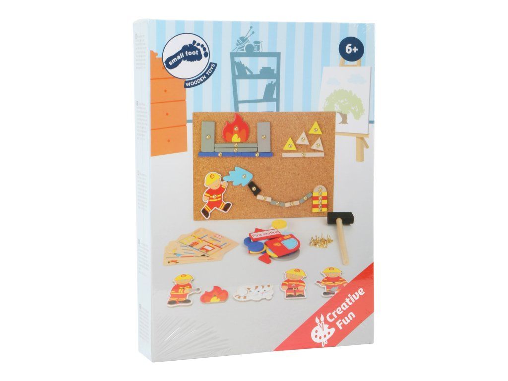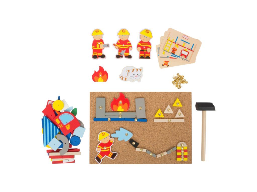 S touto hrou si může každé dítě vyrobit svou vlastní hasičskou stanici na nástěnné desce. Dřevěné a kartonové dílky skládačky mají předvrtané otvory, malé hřebíčky lze snadno zatlouct do korkové desky dřevěným kladívkem. Balení obsahuje také čtyři oboustranně potištěné karty s návrhy motivů. Hlavní vlastnosti: podporuje kreativitu a koncentracipodporuje jemnou motorikupraktický úložný boxDoplňkové parametry