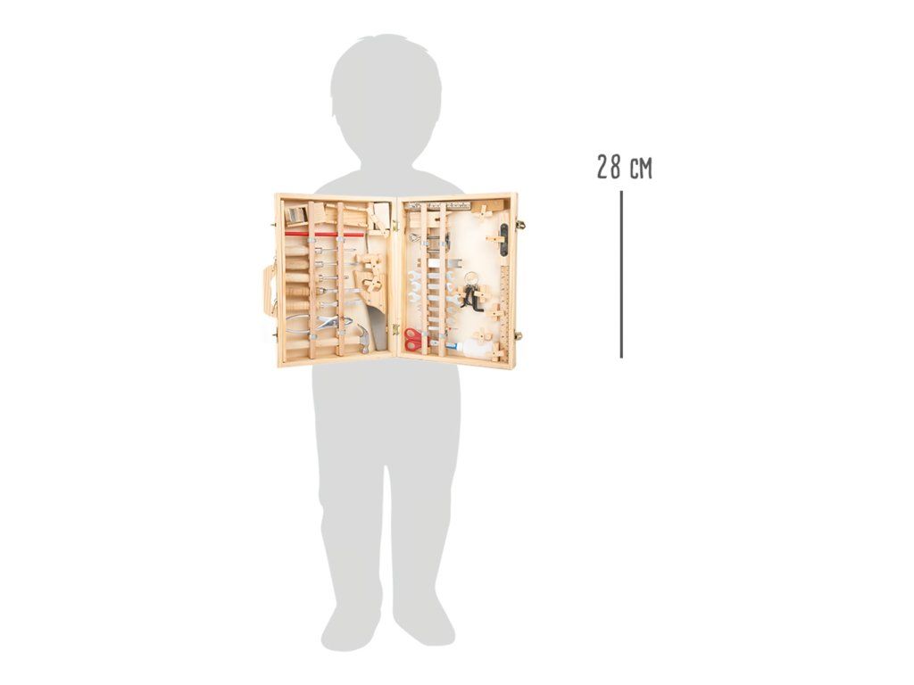 Kufřík Deluxe je komplexní sada nářadí: Závěsná dřevěná krabice s 48 díly pro malé domácí kutily! V kufříku Deluxe najdete všechno potřebné dřevěné i kovové nářadí pro všechny druhy prací a oprav. Najdete v něm klíče, šroubováky, pilu, nůžky, dláto, tesařskou tužku, šestihranný klíč, kladivo a další! Každá položka má své místo v kufru, všechny díly jsou vybaveny pojistkami, které je na svém místě drží. Hlavní vlastnosti: komplexní sada obsahuje 48 dílů praktický dřevěný kufr na uloženíDoplňkové parametry