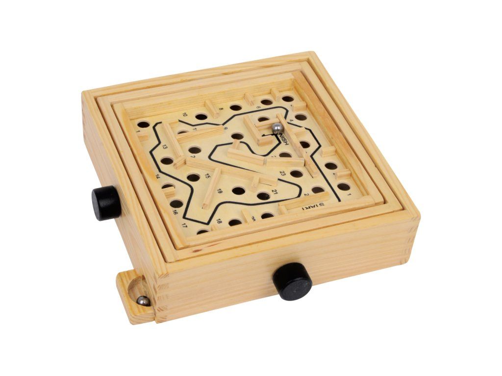 Toto dřevěné bludiště vyžaduje pevné nervy a ruce! Pomocí ovládacích prvků po stranách nakláníte dřevěnou desku tak, abyste kuličku bezpečně dopravili do cíle. Ale pozor: Mnoho děr ztěžuje cestu do středu! Kdo má schopnost dostat kuličku do konečného cíle? Toto je skvělá dovednostní hra pro všechny trpělivé lidi, mladé i staré! Hlavní vlastnosti: procvičuje trpělivost a koncentraciDoplňkové parametry