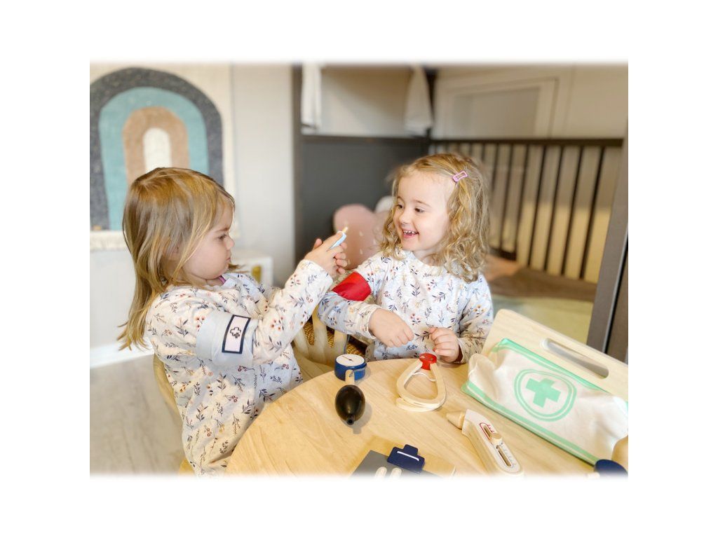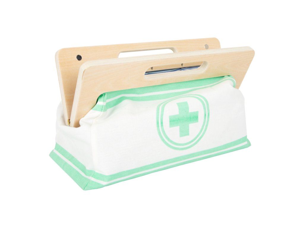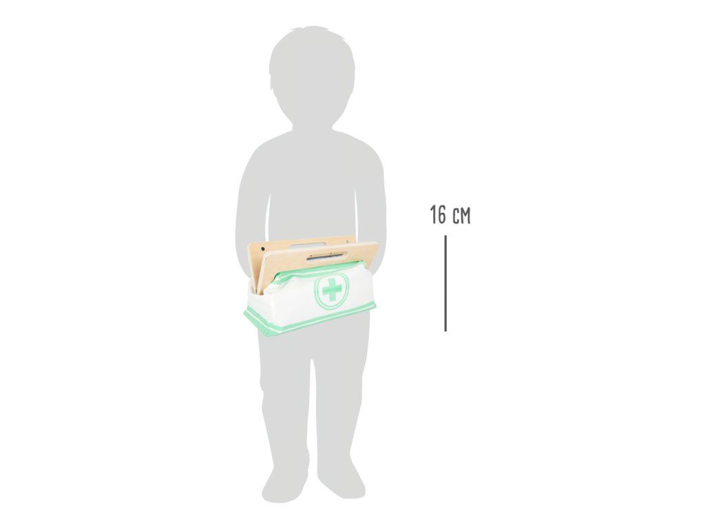 S touto standardní lékařskou brašnou budou mladí nadějní lékaři perfektně vybaveni. Brašna je vyrobená z měkkého textilu, je pěkná na pohled a také velmi funkční. Lze lehce otevřít díky magnetům, je vyrobena ze dřeva. Uvnitř brašny najdete všechno vybavení pro představivé ošetření pacientů: stetoskop, teploměr, stříkačku a mnoho dalšího – vše vyrobeno z pevného dřeva! Nejlepšími doplňky jsou zřejmě tlakoměr s manžetou a balónkem a otoskop s lupou. Tento obsáhlý set lékařských hraček obsahuje mnoho „opravdových“ lékařských nástrojů a přístrojů, s kterými si děti opravdu vyhrají. Ilustrace na lékařských pomůckách dětem poradí rozeznat nástroje a také jim možná zjednoduší jejich použití. Hlavní vlastnosti: Doktorská brašna s jasně viditelným dřevemTlakoměr s manžetou a balónkemTeploměr s nastavitelnou teplotouOtoskop s opravdovou lupouLahvička na léky se šroubovatelným víčkemNáplasti na suchý zipZnovu použitelné a pratelné dětské textilní rouškyDalší vybavení: injekční stříkačka s pohyblivým mechanismem, stetoskop, dezinfekce s pumpičkou, lahvička s léky a lžička, pinzeta, skalpel, reflexní kladivoDoplňkové parametry