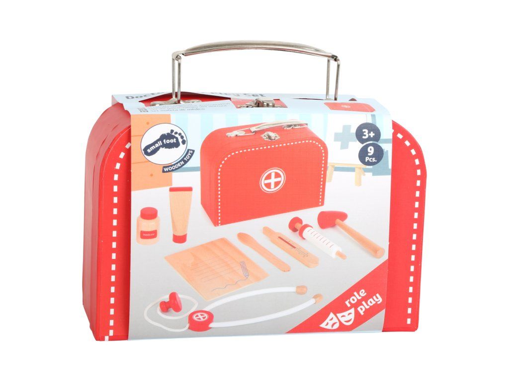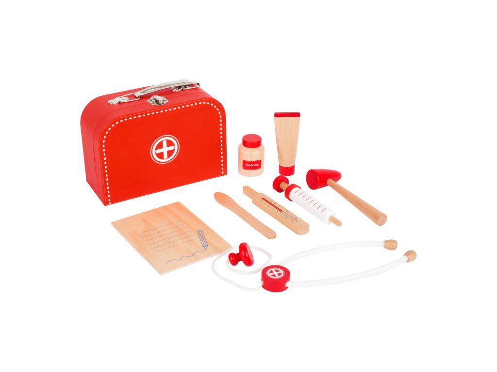O zdraví panenek a plyšáků bude s doktorským kufříkem dobře postaráno! Obsahuje všechny důležité nástroje a pomůcky. Injekční stříkačka je vybavena pohyblivým pístem, aby hra byla uvěřitelná a děti se mohly cítit jako skuteční lékaři. Pevný a skladný kufřík je vybaven odolným kovovým zavíráním a uchem. Všechny součásti jsou robustní, vyrobené z masivního dřeva, opatřené zaoblenými hranami a kvalitní, hladkou povrchovou úpravou. Hlavní vlastnosti:stetoskop, injekce, kladívko, teploměr, špachtle, tuba, lékovka a zápisníkkufřík s odolným zavíráníminjekce s pohyblivým pístemrobustní a odolné provedení z masivního dřevaDoplňkové parametry
