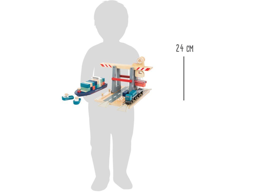 Skvělá zábava pro malé kormidelníky, která nesmí chybět v žádném pokojíčku! Tato hrací sada obsahuje základní desku s kolejemi pro vláčky s mostem a pohyblivým magnetickým jeřábem. Součástí sady je také kontejnerová loď s dvěma remorkéry, které k ní jsou přivazány provázkem. Díky magnetům na kontejnerech je možné jeřábem přemisťovat náklad z místa na místo. Hlavní vlastnosti: sada je kompatibilní s ostatními standardními vláčkodráhamivyrobena ze 100% certifikovaného dřeva FSC® Značka a certifikát FSC® (Forest Stewardship Council) zaručuje, že dřevo, ze kterého byl produkt vyroben, nebylo vytěženo nelegálně a pochází z lesů obhospodařovaných šetrným či přírodě blízkým způsobem, ve kterém jsou dodržovány přísné environmentální a sociální požadavky. Značka FSC® na výrobku znamená, že svým nákupem pomáháte chránit lesy a podporujete šetrné, odpovědné či přírodě blízké hospodaření, díky kterému jsou naše lesy stabilnější, zdravější, mají přirozenou druhovou skladbu a lépe odolávají negativním následkům klimatických změn.Doplňkové parametry