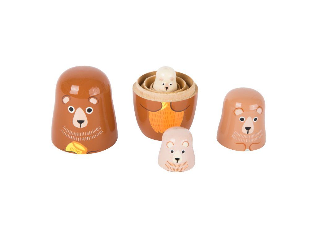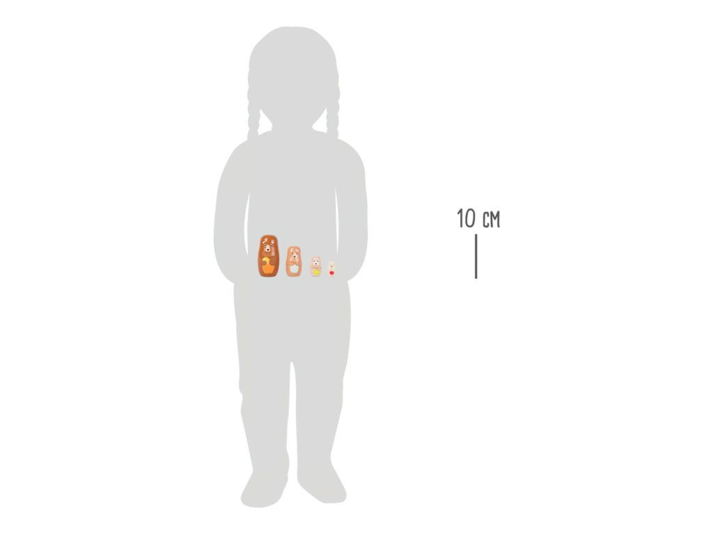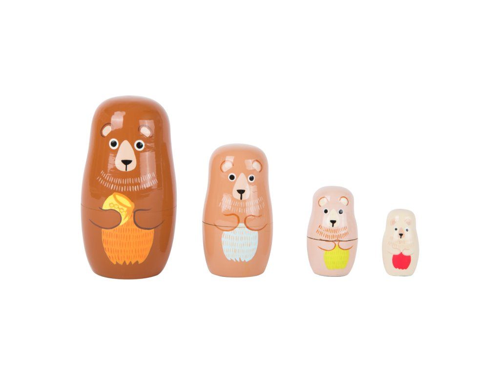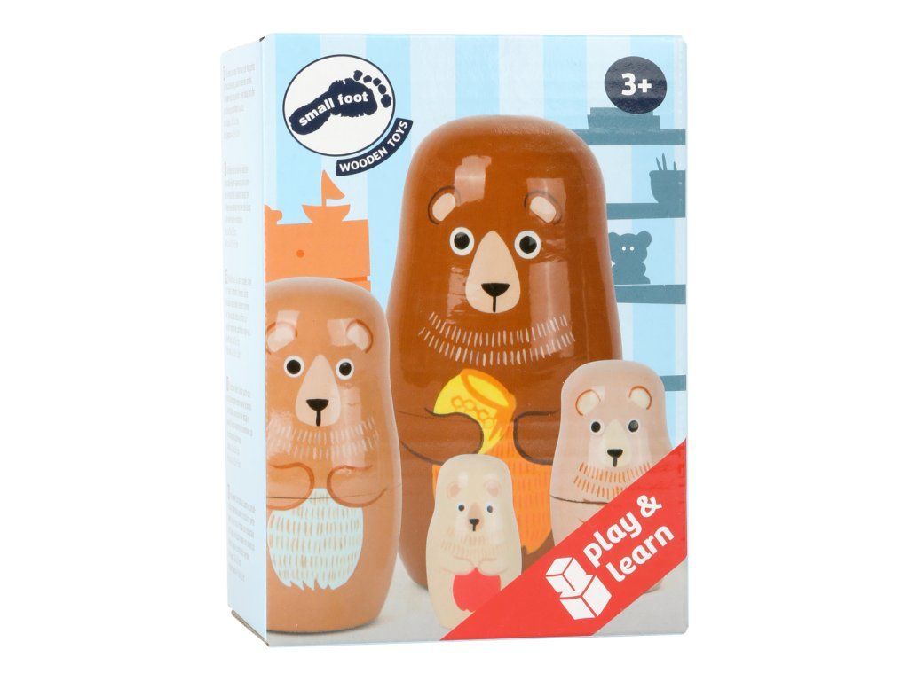 Čtyři láskyplně malované figurky Matrjošky v podobě medvědí rodiny. Menší medvídci se podle velikosti postupně schovávají do sebe. Tyto panenky se snadno uprostřed otevírají, což je skvělá praxe pro koordinaci ruka-oko a jemné motorické dovednosti. Figurky Matrjošky vyzařují své jedinečné kouzlo a jsou roztomilé na pohled - lákavý poutač s velkým studijním potenciálem pro Váš dětský pokoj! Hlavní vlastnosti: 4 figurky medvědí rodinkyrozvíjí koordinaci ruka-oko a jemné motorické dovenostiDoplňkové parametry