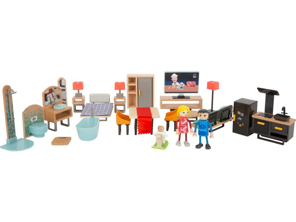 Kompletní set nábytku do domečku pro panenky. S touto rozsáhlou sadou si děti budou moci vybavit svůj domeček stylově. V balení najdete lednici, kuchyňskou linku se sporákem a digestoří, stůl a židle, noční stolky, lampu, gauč, konferenční stolek, vanu, sprchový kout, umyvadlo se zrcadlem, toaletu, váhu. Dále také 3 figurky, které se mohou v domečku zabydlet. Nábytek je z velké části dřevěný, vhodný pro panenky do 12 cm. Tato moderní a obzvláště rozsáhlá sada nábytku pro panenky je ideálním doplňkem řady domečků pro panenky a boduje současným stylem vybavení, který navazuje na oblíbený interiérový trend. Hlavní vlastnosti: stylové a moderní, vkusný designpro panenky do výšky 12 cmDoplňkové parametry