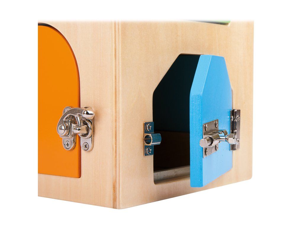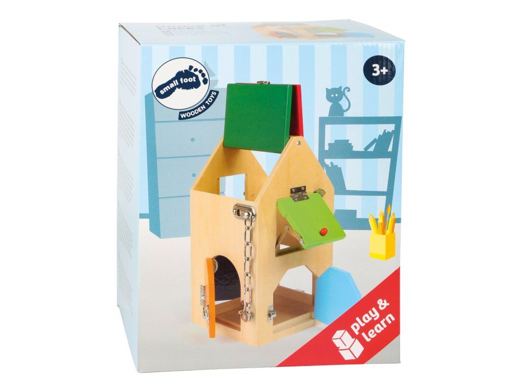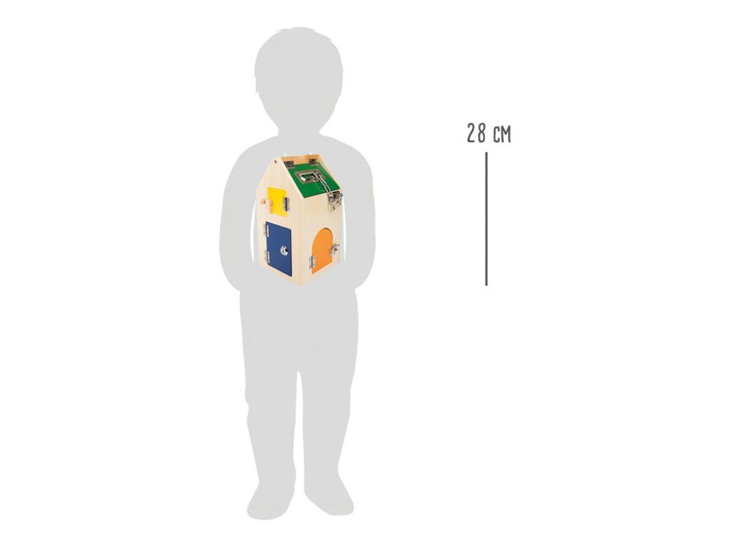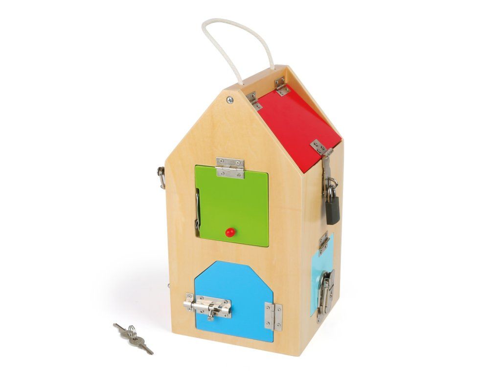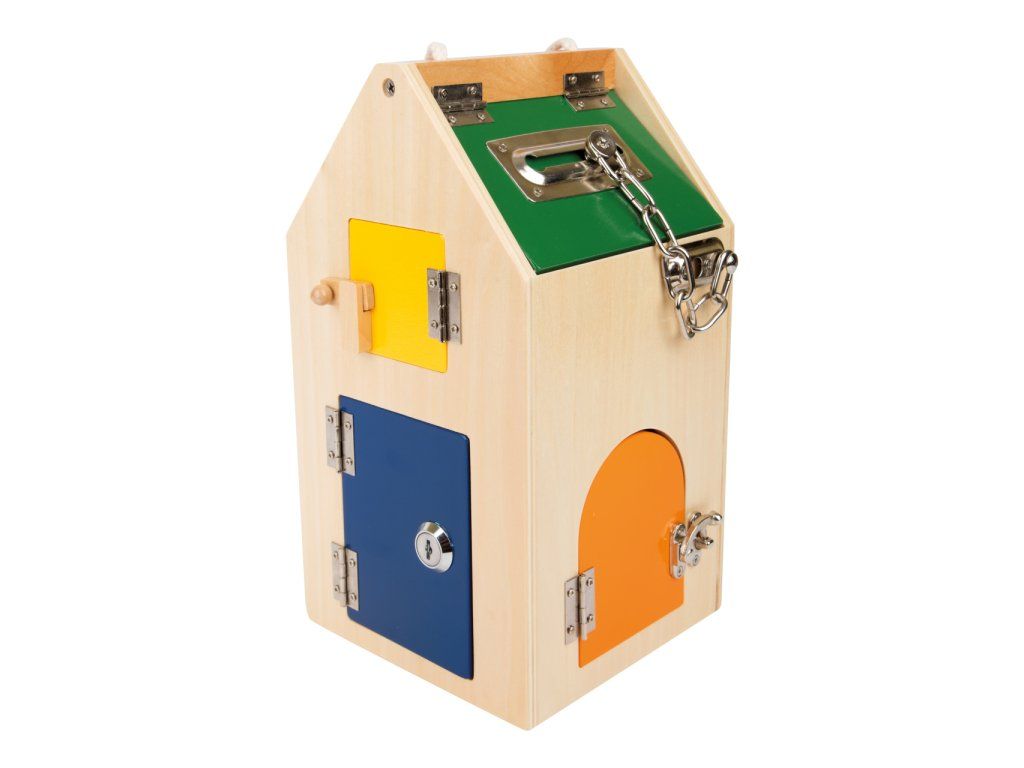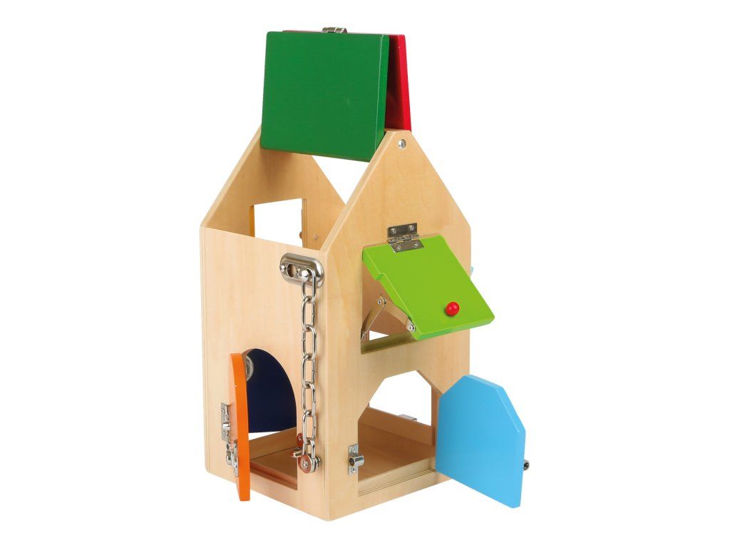 Na tomto dřevěném domku s vysoce kvalitním zpracováním nejdete U zámek a cylindrický zámek, různé šrouby, páky, panty a bezpečnostní řetěz, které trénují motoriku dětí. Navíc se velmi snadno přepravuje a zajišťuje "klíčové" zážitky! Vyroben z odolného dřeva a pevných kovových částí. Hlavní vlastnosti: rozvíjí jemnou motoriku dětípodporuje zvídavostDoplňkové parametry