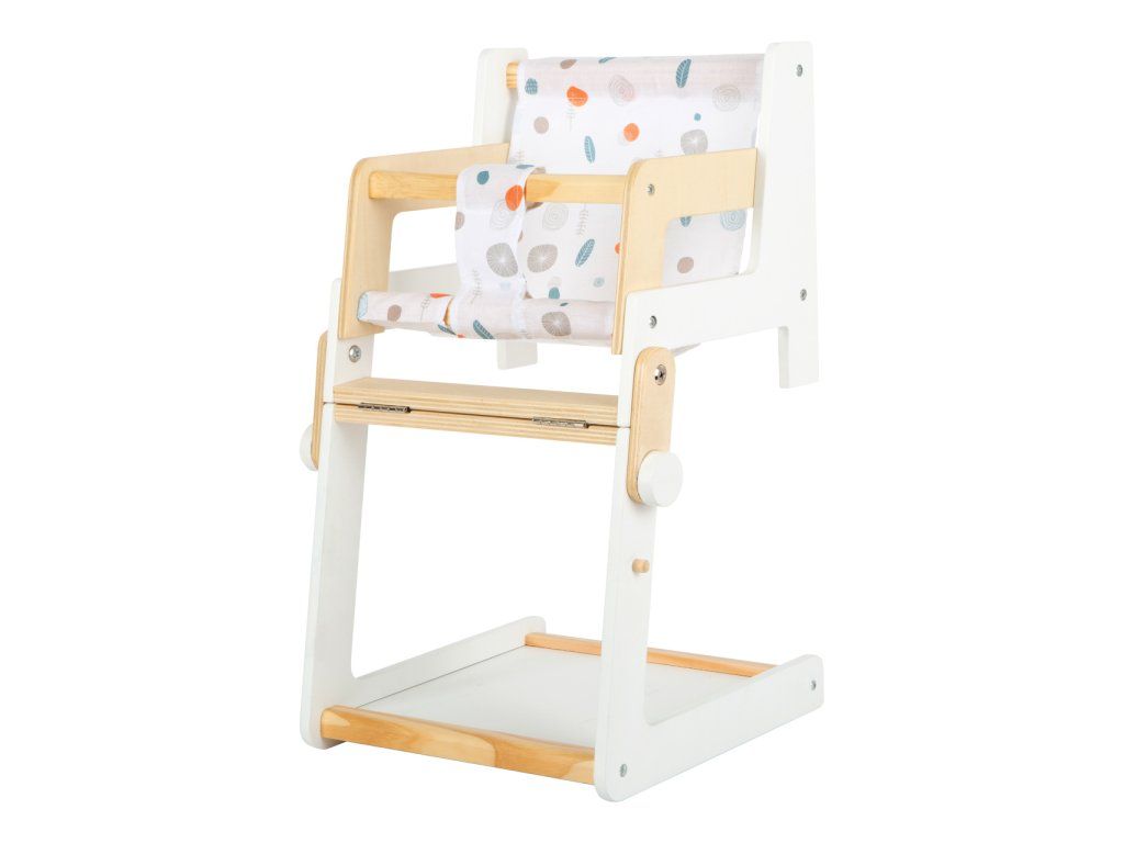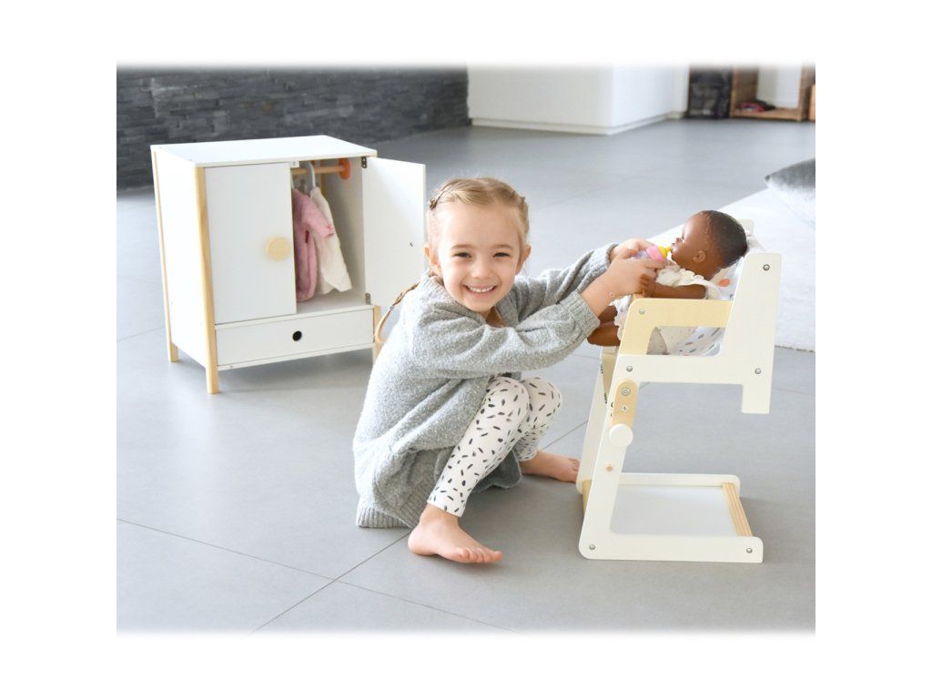 Multifunkční vysoká židlička pro panenky, která jistě nadchne mladší i starší „rodiče“ panenek. Má jednoduchý skandinávský design, je vyrobena z kvalitních materiálů. Jen pár pohybů rukou a vysoká židle může být přeměněna v židličku se stolem. Je vhodná pro panenky a plyšáky do ~46 cm. Díky jednoduchému designu se hodí do každého interiéru. Je viditelně dřevěná a má zaoblené hrany. Hlavní vlastnosti Skandinávský designPro panenky a plyšáky do 46 cmZaoblené hrany Little Button Řada atraktivního příslušenství pro panenky Little Button nabízí pestrou paletu výrobků, od kočárku přes jídelní židličku až po skříň. Zákazníky snadno zaujmou jednotným funkčním a decentním designem využívajícím přímé linie a střídmé neutrální barvy. Díky tomu spolu mohou vytvořit ucelené harmonické soupravy, které vkusně doplní moderní interiér. Důmyslná konstrukce a kvalitní zpracování pomáhají zajistit vysokou stabilitu, bezpečnost a dlouhou životnost. Založte s jejich pomocí stylový koutek pro panenky, kde mohou Vaše děti rozvíjet svou fantazii a pečovatelské dovednosti.Doplňkové parametry