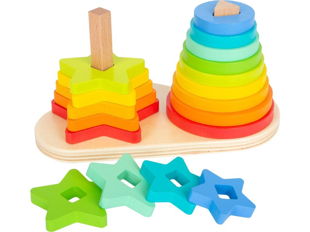 Barevná jako duha! Tato nasazovačka a vkládačka ve tvaru hvězdičky a kolečka nadchne všechni děti! Cílem je dílky seřadit podle tvaru a velikosti ve správném pořadí. Hračka naučí děti rozeznávat tvary, barvy a velikosti, také procvičí jejich motoriku a koordinaci ruka-oko. Nekonečné možnosti nasazování! Kdo dokáže postavit duhu? Hlavní vlastnosti: jasné a výrazné barvyzákladová deska a 18 dílůDoplňkové parametry
