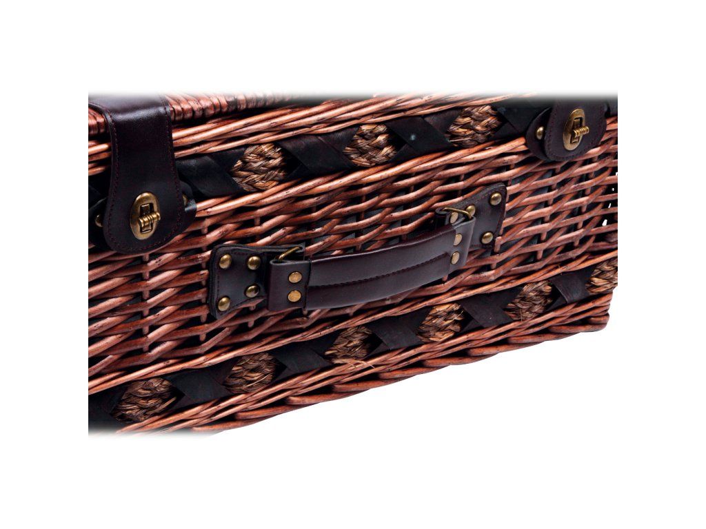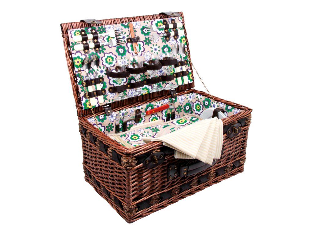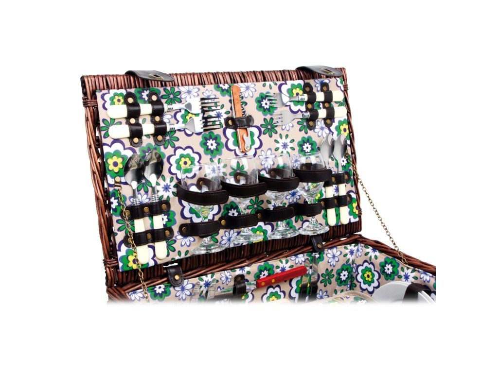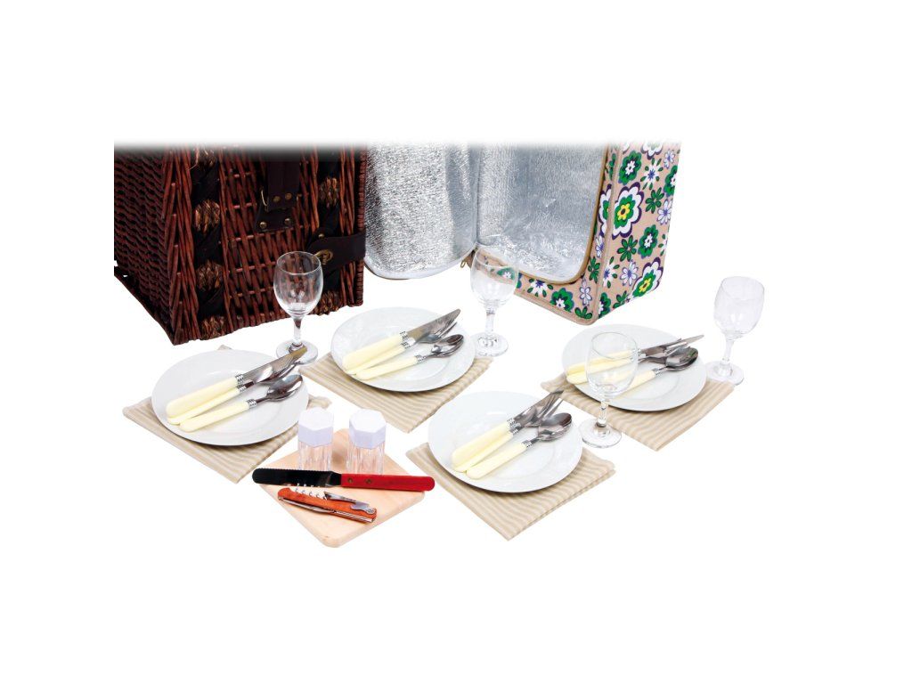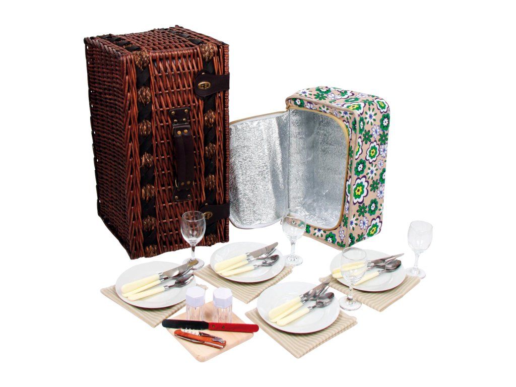 Perfektně vybavený proutěný piknikový koš se silnými proutěnými úchyty a bezpečnými koženými poutky. Koš je kompletně vybavený pro 4 osoby včetně talířů, příborů, sklenic na víno, nožem, pepřenkou, solničkou a ubrousky. Koš je také vybaven vyjímatelnou chladící kapsou, která udržuje jídlo a pití v chladnu! Hlavní vlastnosti: koš je kompletně vybavený, vyrobený z přírodního proutívyjímatelný chladící boxDoplňkové parametry