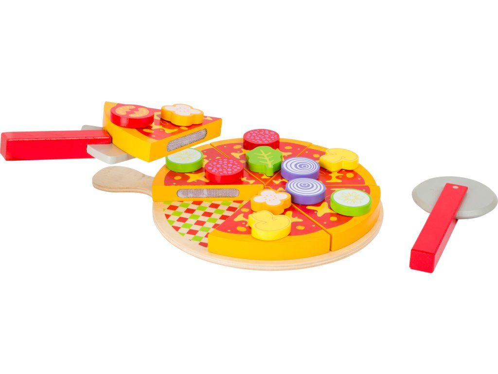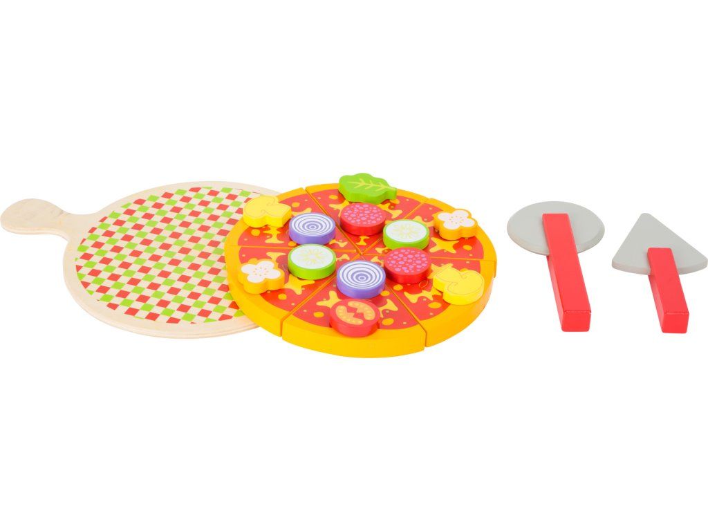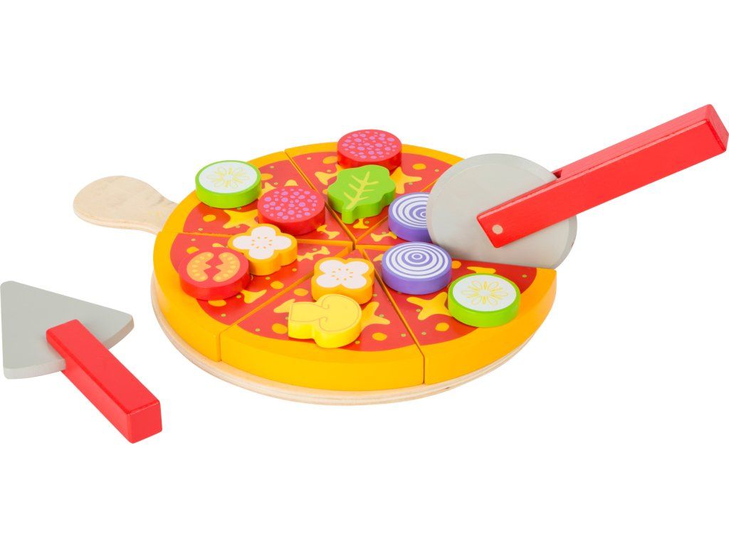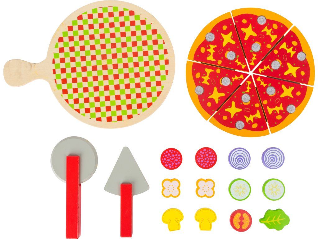 Je čas na pizzu! Tuto dřevěnou pizzu lze kreativně sestavit a vyzdobit zeleninou či salámem. Plátky pizzy jsou spojeny na suchý zip a lze je rozdělit přiloženým kráječem na pizzu. Pokrm lze hladovým hostům prezentovat na dřevěné desce a podávat pomocí lopatky na pizzu. Hlavní vlastnosti: obsahuje 21 ksjednotlivé díly lze propojovat suchým zipemtrénuje motoriku, aktivní hraní rolí a rozvoj sociálních dovednostíDoplňkové parametry