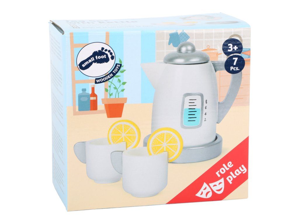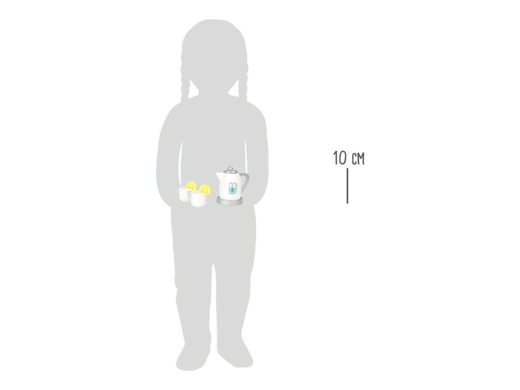 Není nad šálek horkého čaje ozdobený šťavnatým plátkem citrónu! Naučte děti pravidla servisu a společenského chování se soupravou rychlovarné konvice a hrníčků. Skvěle doplní dětské kuchyňky, jiné servisy, snídaňové sady, nebo makety pečiva a zákusků. Součásti jsou vyrobeny z kombinace masivního dřeva a silné překližky, hračka díky tomu může nabídnout vysokou odolnost a životnost. Hlavní vlastnosti:konvice s víčkem a podstavou, 2 šálky a 2 citrónyrobustní a odolné dřevěné provedeníDoplňkové parametry