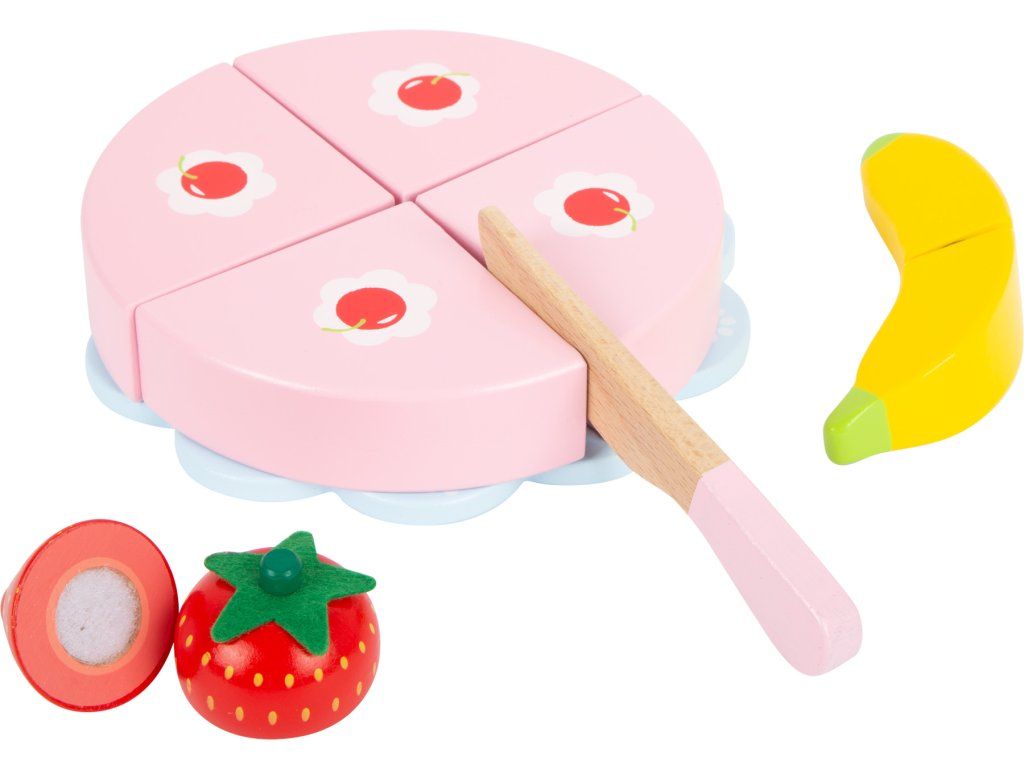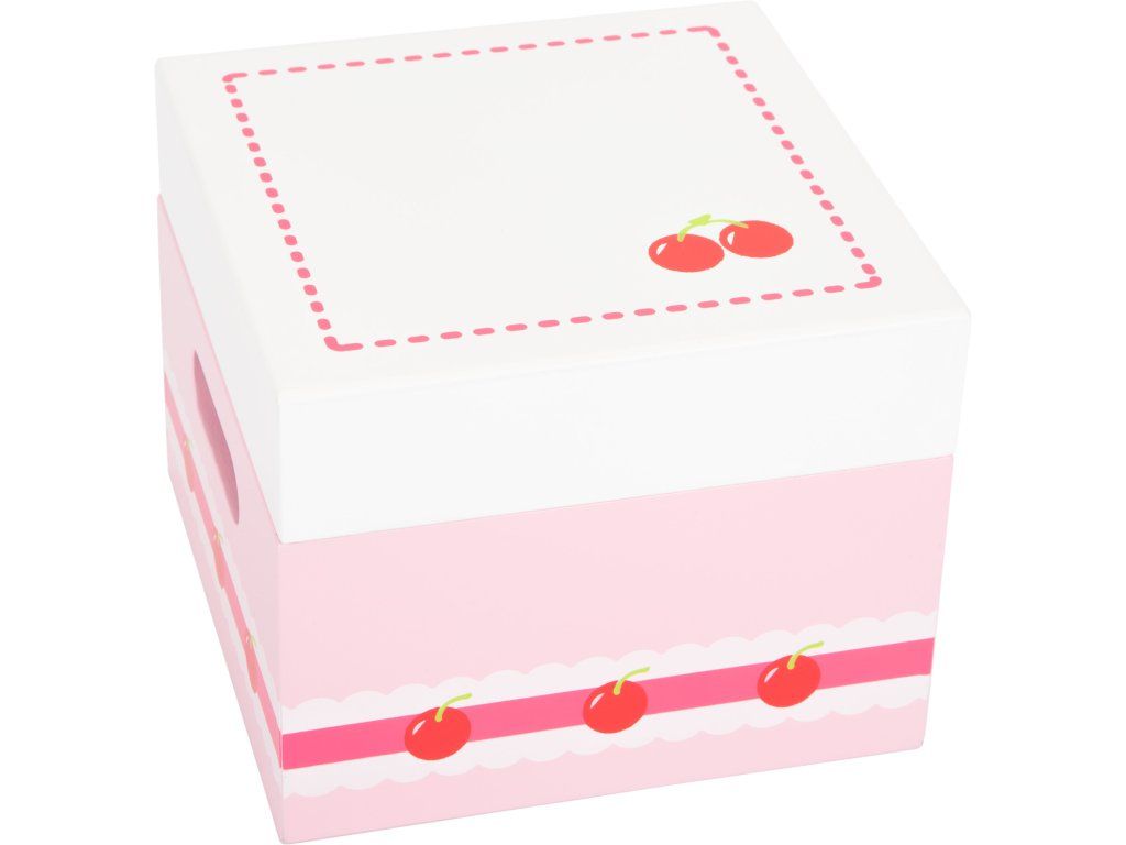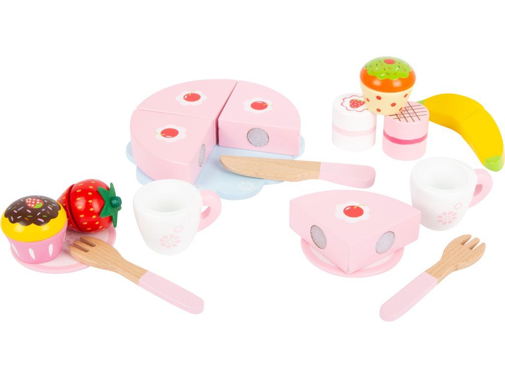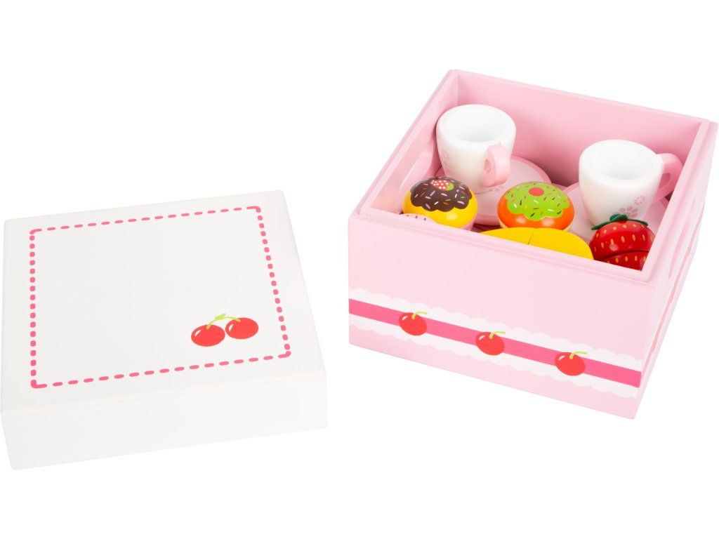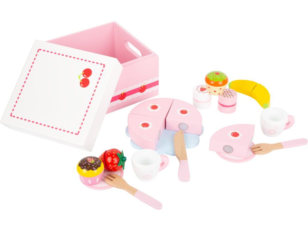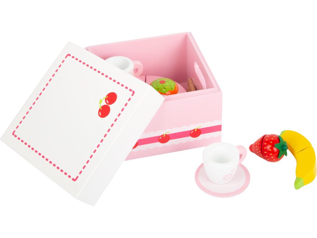 Mlsání povoleno! S tímto dřevěným boxem plným dobrot si děti užijí mnoho zábavy. Ať už jsou to muffiny, dort, sušenky, banán nebo jahoda – každý si zde najde to své. Sadu doplňují dva šálky, talířky, příbor. Krabice se dá jednoduše uzavřít, na boku má otvory pro jednodušší úchop. Hračka dětem pomůže s rozvojem sociálních dovedností, mohou si ji také přidat do dětské kuchyňky, také trénuje motoriku. Dort se dá nákrájet – dílky drží pohromadě suchý zip. Hlavní vlastnosti Krabice s víkem s pěknou ilustracíŠálky, talíře, příborDort, muffiny, ovoceDoplňkové parametry